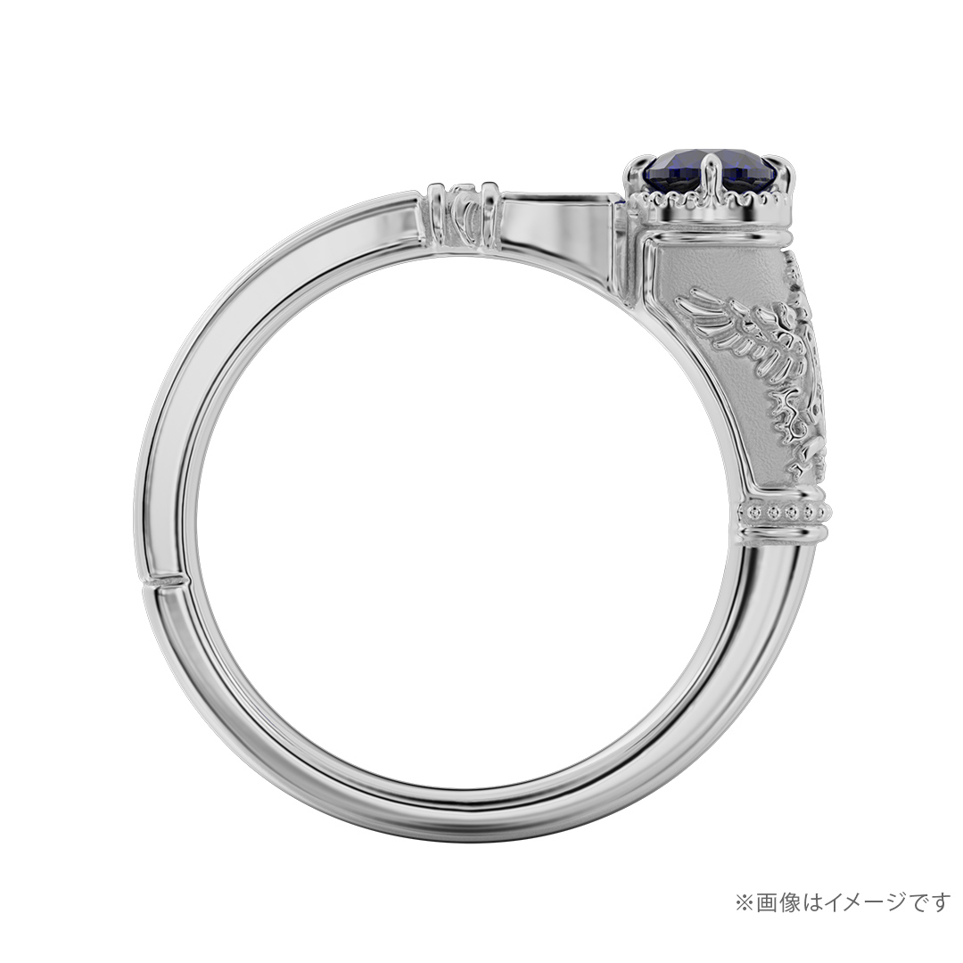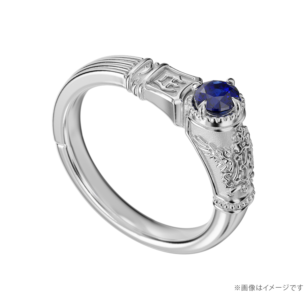 正面是哥德風格的「C」字母,中央鑲有合成藍寶石,藍銀配色超典雅,戒指側邊刻有凡多姆海伍家族的家徽。