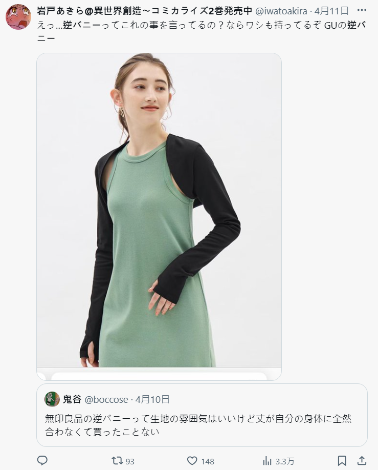 雖說推主似乎因為不知道這種衣服到底叫什麼才稱這個叫「逆兔女郎裝」,部過不少網友表示這形容好像也算合理,看來 GU 賣的這件也是「逆兔女郎裝」吧 www。