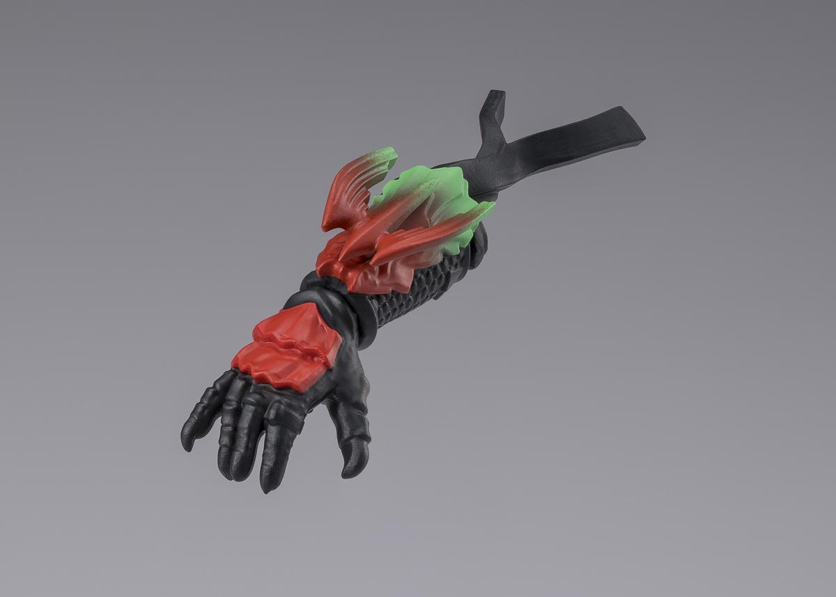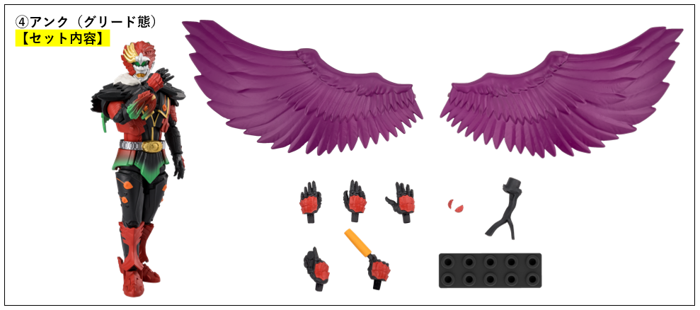 以豐富的色彩塗裝再現身上的紅、綠漸層色,配件附有背部的可動雙翼、多種造型手、裂成兩半的核心硬幣,更能將右手分離裝上布料零件再現不完全形態。