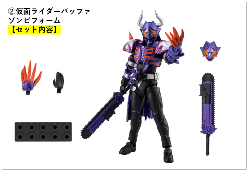 附有雙手的一般手掌、巨爪手掌替換零件、專用武器「殭屍破壞者」,以及與假面騎士GEATS連動的替換用面罩零件。