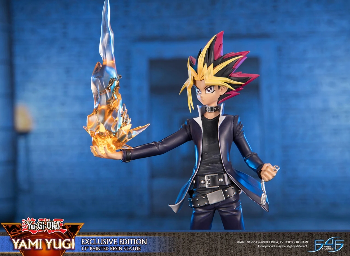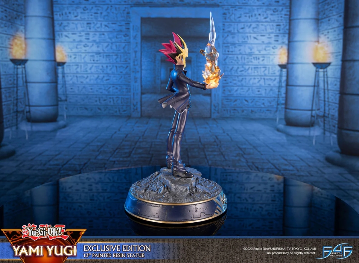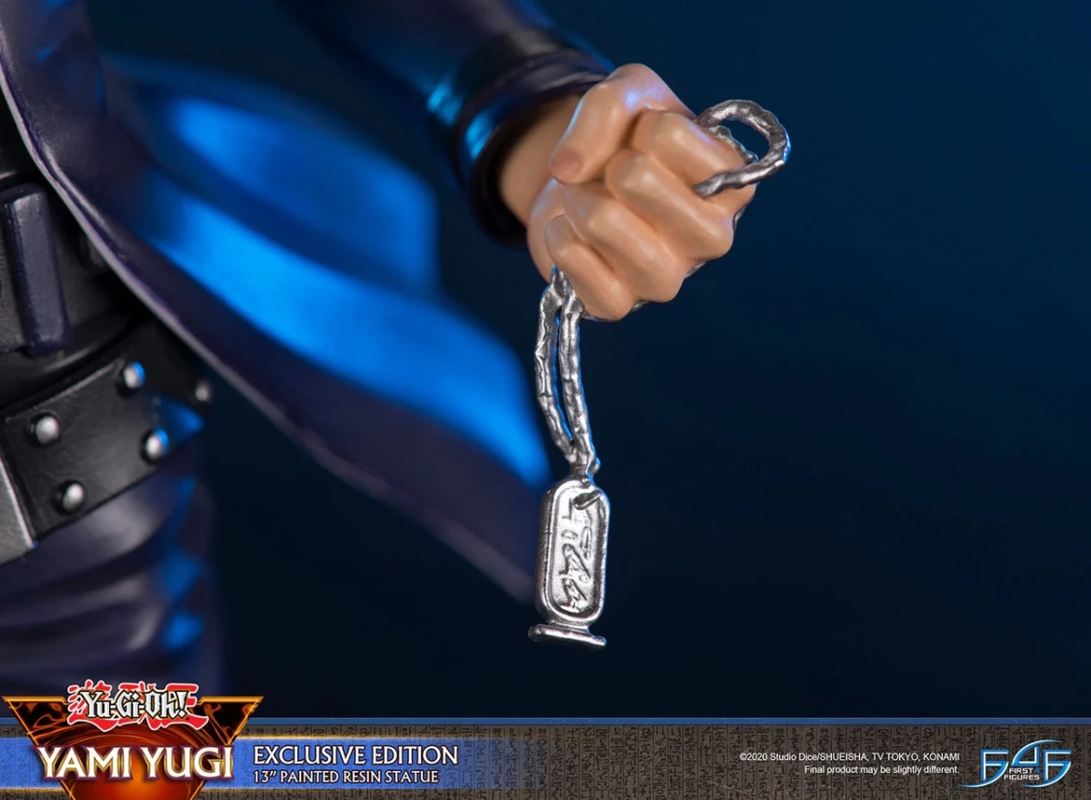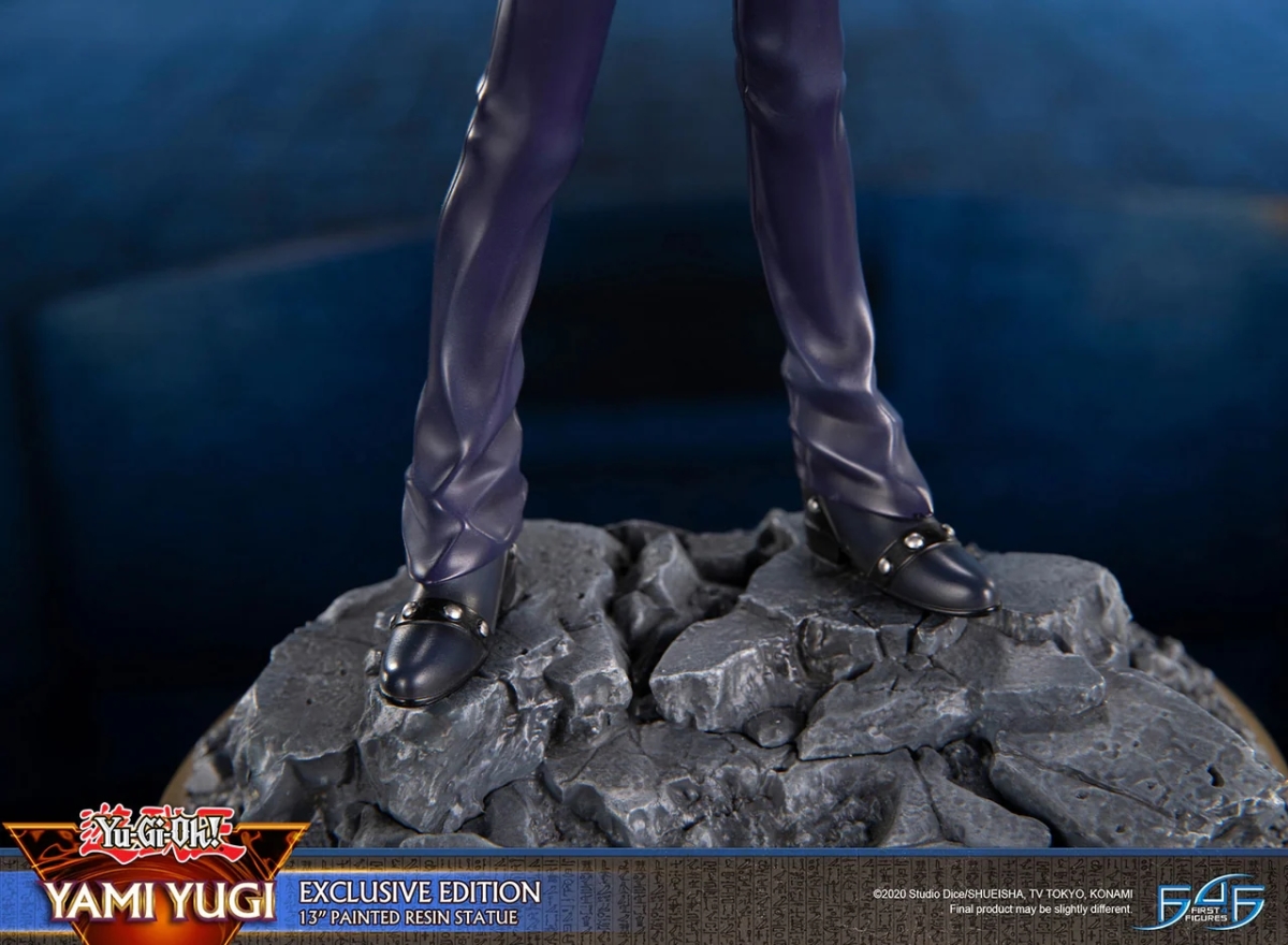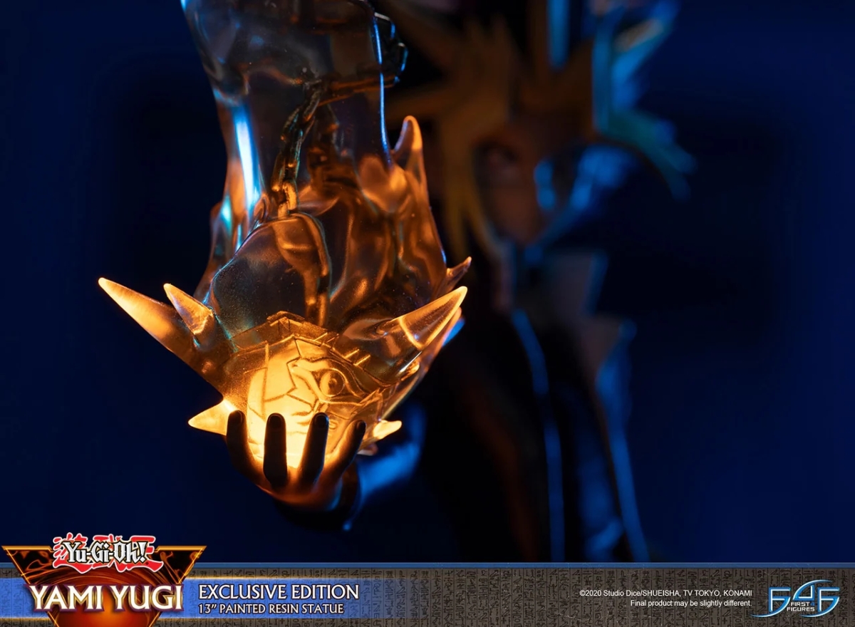 本次 F4F 採用 31 公分高的規格將《遊戲王》故事中的最強決鬥王立體化,將經典的海星頭與金色瀏海、線條銳利的長褲與外套、極具存在感的腰帶、尖頭黑色皮鞋等角色特色考究還原,動作部分則讓闇遊戲右手拿著千年積木,搭配特效件傳達出千年神器彷彿正在展現其神秘力量的瞬間。加上細膩刻畫的底座,的確是 F4F 一貫的作品風格;但在闇遊戲本人神韻的部分小編個人總覺得少了一些霸氣。