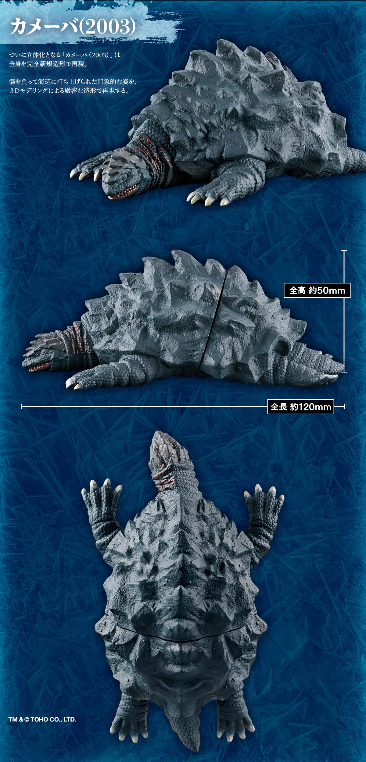卡美巴(2003)則運用 3D 建模技術忠實再現電影中趴在海灘上的屍體模樣,細膩製作出複雜的龜殼形狀、粗糙的皮膚紋路以及脖子上致命的爪痕。能與哥吉拉(2003)本體一同展示,實現電影中未有的兇案現場。