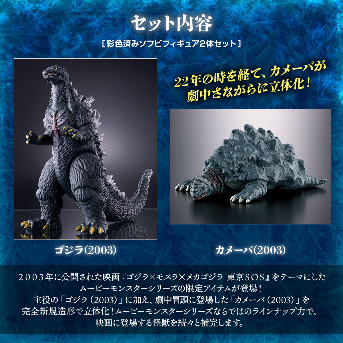 由日本萬代玩具公司發行的人氣特攝・怪獸主題軟膠玩具『MOVIE MONSTER』系列,發表了出自電影《哥吉拉×摩斯拉×機械哥吉拉 東京SOS》的最新商品「哥吉拉(2003) with 卡美巴(2003)」預計於 2025 年 09 月發售的消息。