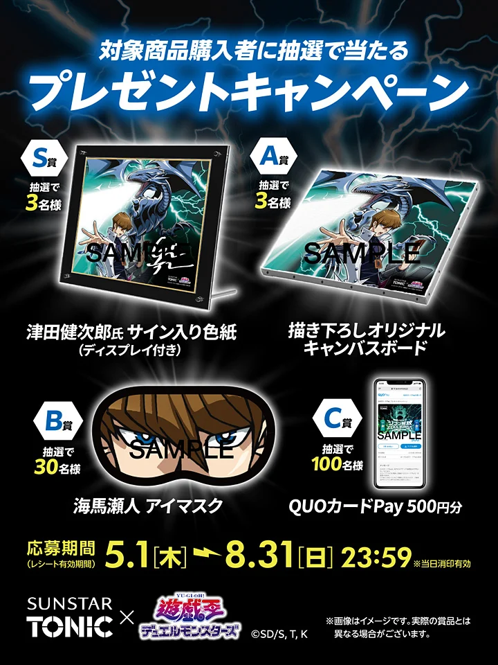 日本健康美容的品牌 SUNSTAR,近日宣布將與問世邁入 30 周年的《遊戲王》展開合作,並以「海馬瀨人」和他的王牌怪獸「青眼白龍」作為主題,打造專屬的聯名瓶裝,且釋出了聯名宣傳影片,更有許多抽獎活動,甚至有機會獲得「青眼白龍」全新插圖卡牌。
