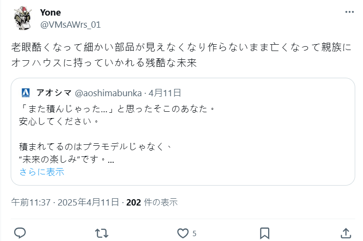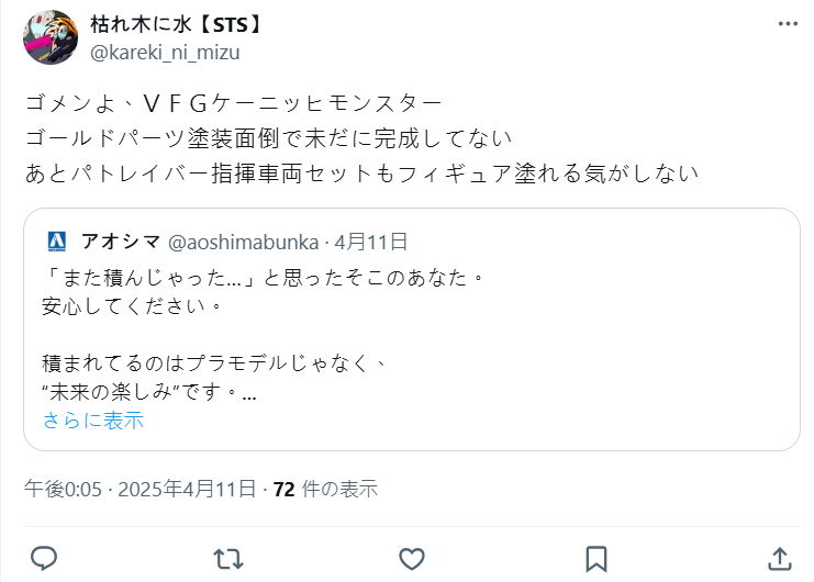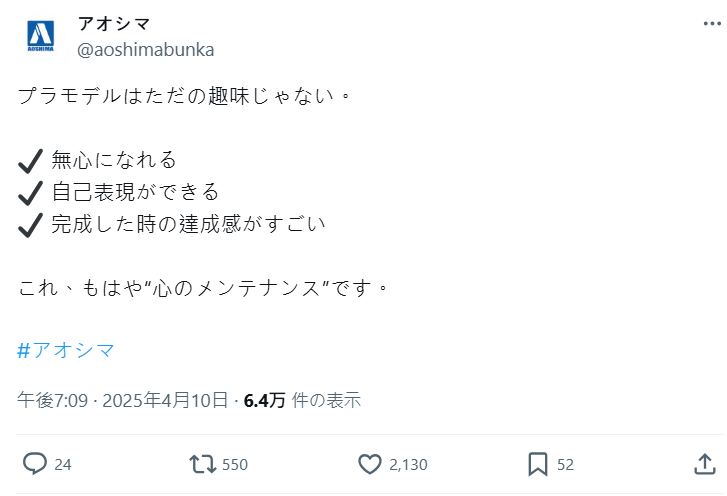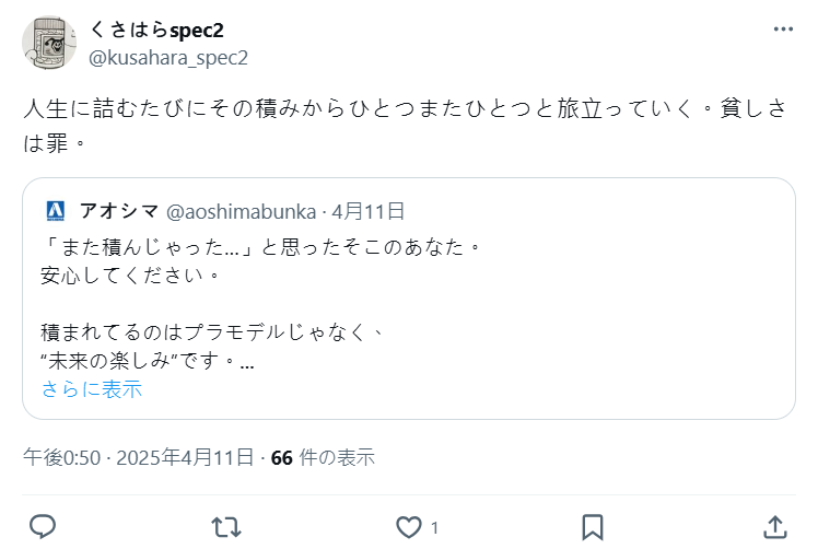 知名日本模型廠商「青島文化教材社」(アオシマ)近日在 X 上發表了一段溫暖人心的話語,引起了廣大模型愛好者的熱烈共鳴。不僅巧妙緩解了玩家們對「山積」的罪惡感,更像是一股溫柔的鼓勵,讓大家重新審視模型的意義。
