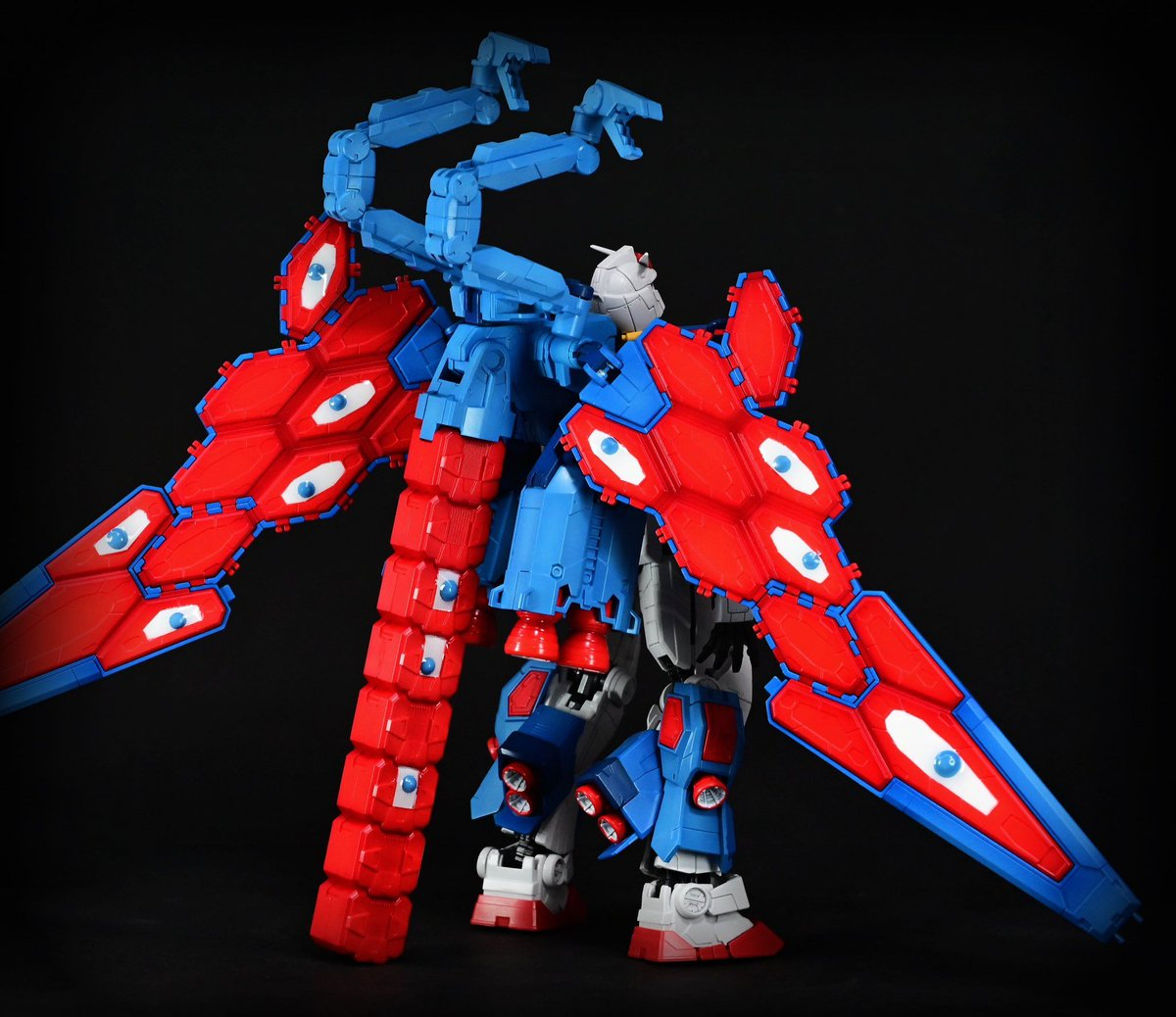 塗裝完成後,連推主自己都嚇了一跳,沒想到原本搭載的「璃羽裝備」、「光束熔接槍 展開/收納狀態」、「立像版替換用背包」居然如此相稱,塗裝上紅藍色的招牌,並在各處點綴出脈脈的眼球,效果真的十分出色。