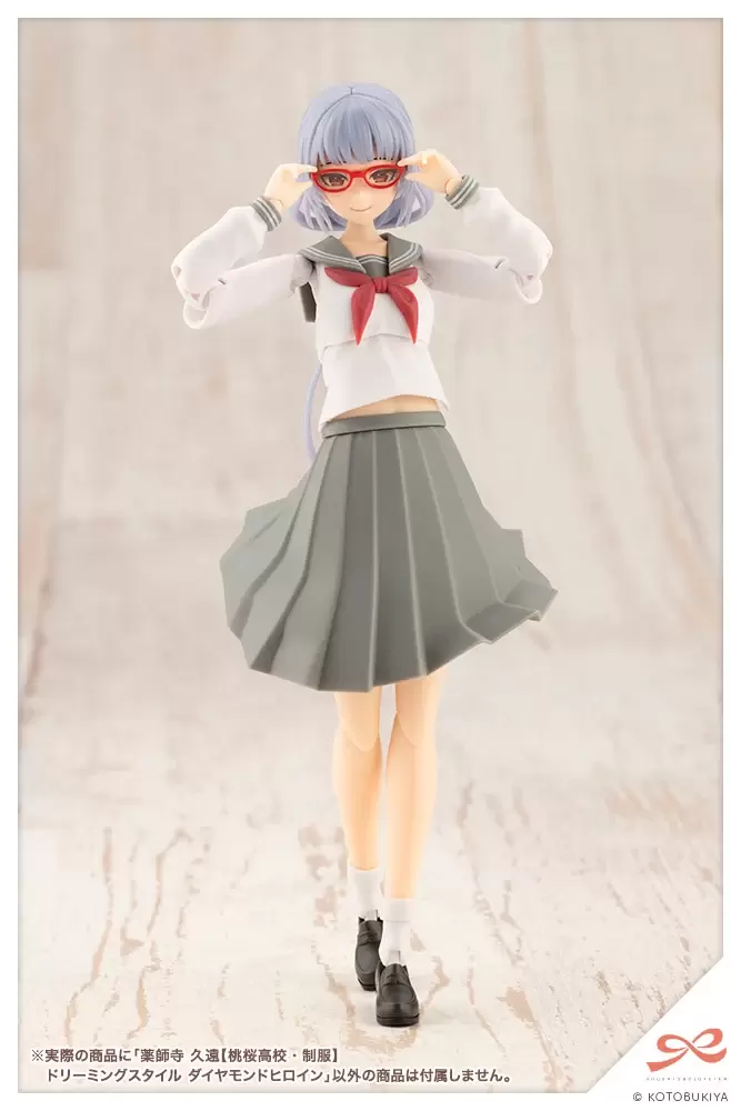 「藥師寺久遠【桃櫻高校・制服】夢想風 鑽石女主角」基於一般版修改而來,領口、袖口、裙子零件的成型色換成了灰綠色,頭髮零件則是與先前發表的「藥師寺久遠【篝火 真里亞・衣装】夢想風 暴雪女優」相同的灰藍色調,展現復古又優雅的色彩風格。