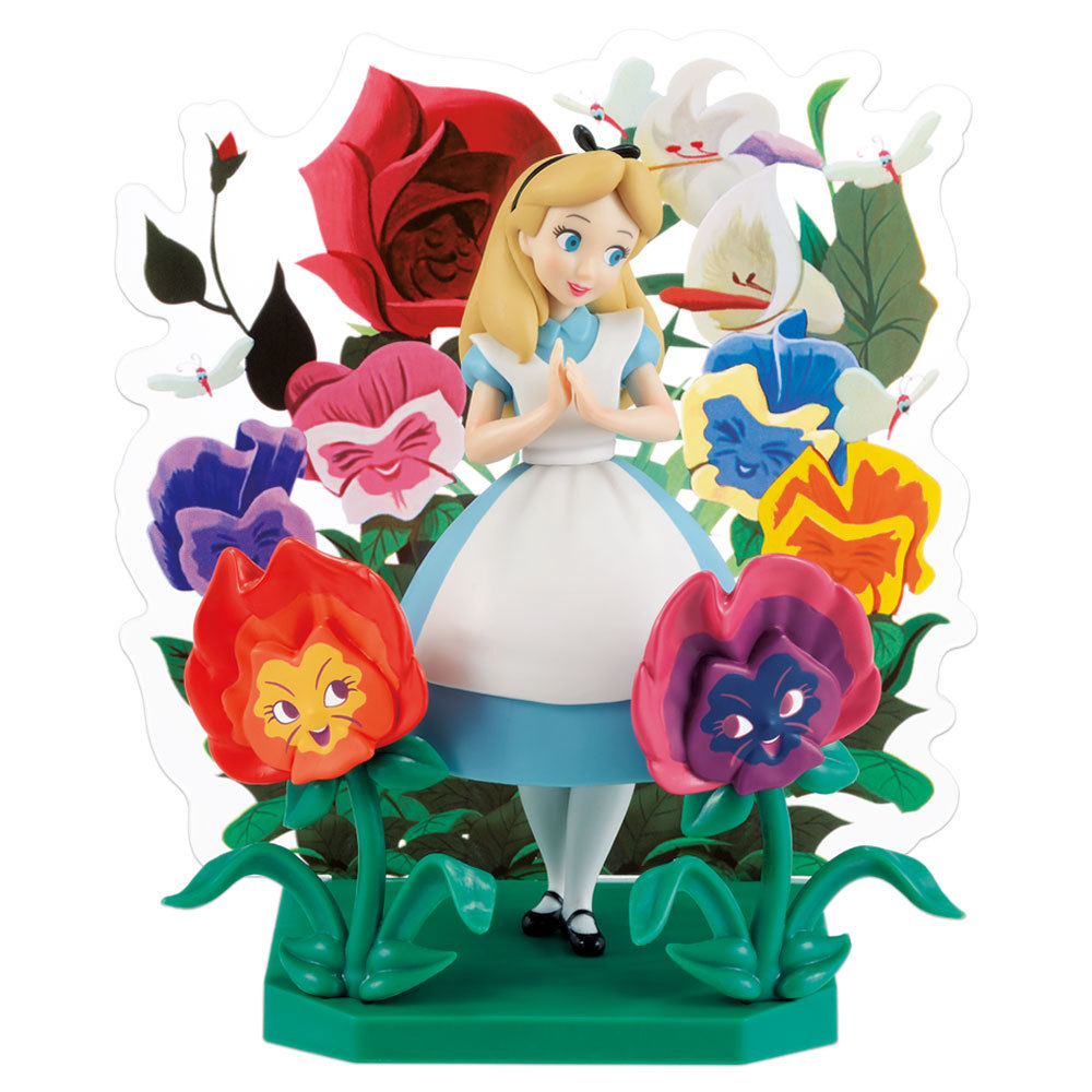 本次的「迪士尼Melody in a Dream」提供A~K、最後一賞與雙重中獎賞等不同級別的賞品,其中A賞為《愛麗絲夢遊仙境》的角色模型,將電影中演唱〈All in the Golden Afternoon〉時的場景立體化,雕刻重現愛麗絲在劇中的造型細節,塗裝還原花朵唱歌時的模樣,並在後放附上印製有背景圖的壓克力板,精緻再現劇中的場景!