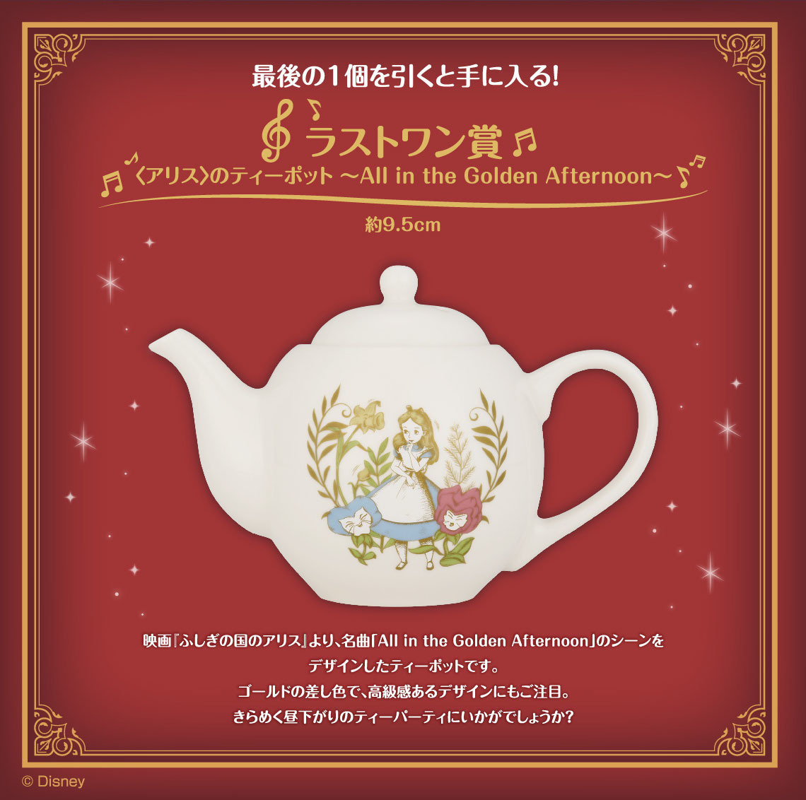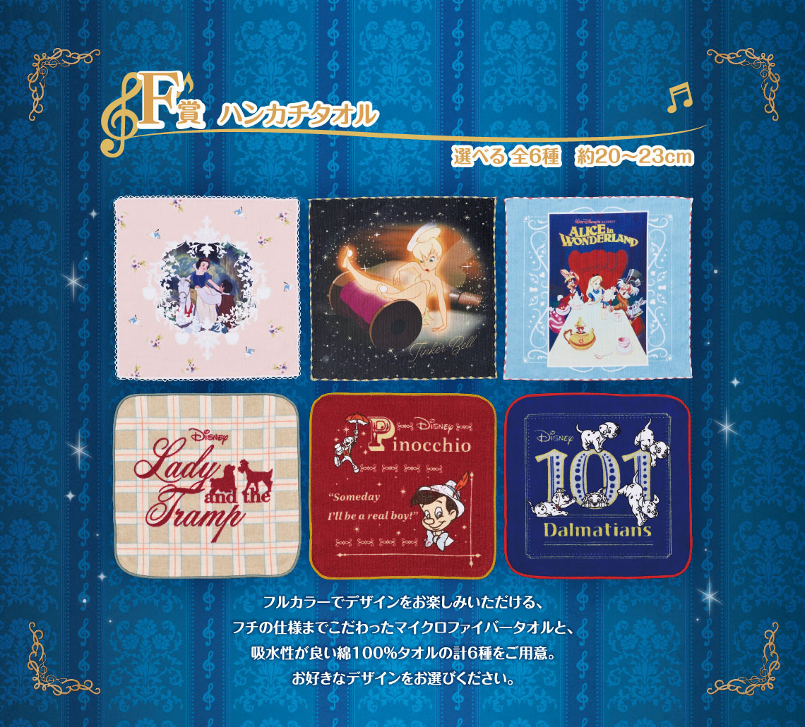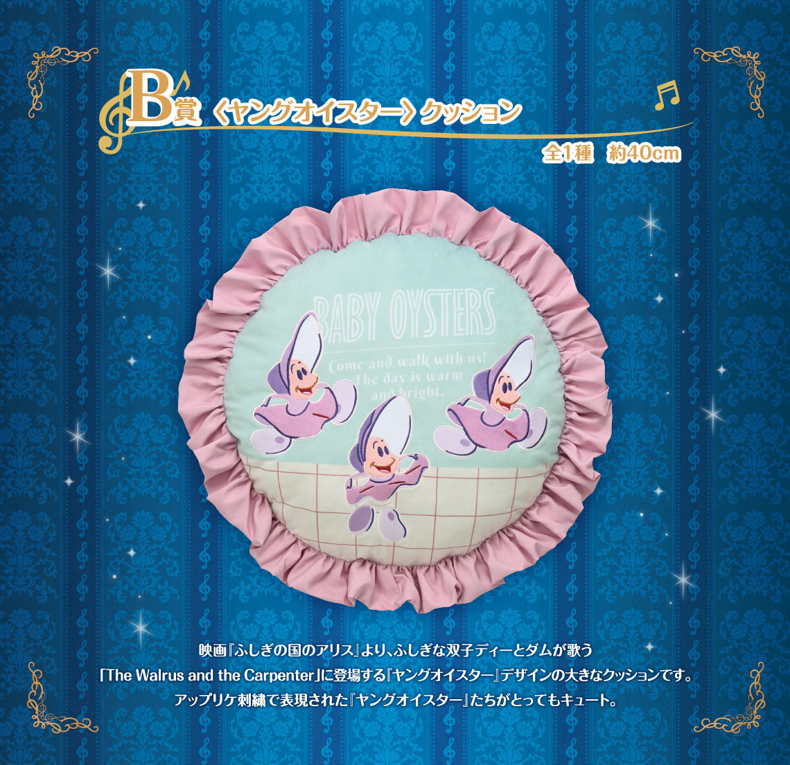 B~H賞為牡蠣寶寶的造型抱枕、《小飛俠》的造型盤、《小飛俠》視覺毛巾、迷你角色吊飾、手帕毛巾、橡膠製品收藏和文具套組,最後一賞則是《愛麗絲夢遊仙境》主題的茶壺,每款賞品都印有展現迪士尼動畫電影的強大魅力的插圖,而雙重中獎賞更提供了A、B賞的套裝,可以同時擁有角色模型《愛麗絲夢遊仙境》和牡蠣寶寶的造型抱枕,喜歡迪士尼的各位玩具人千萬不要錯過這次機會!