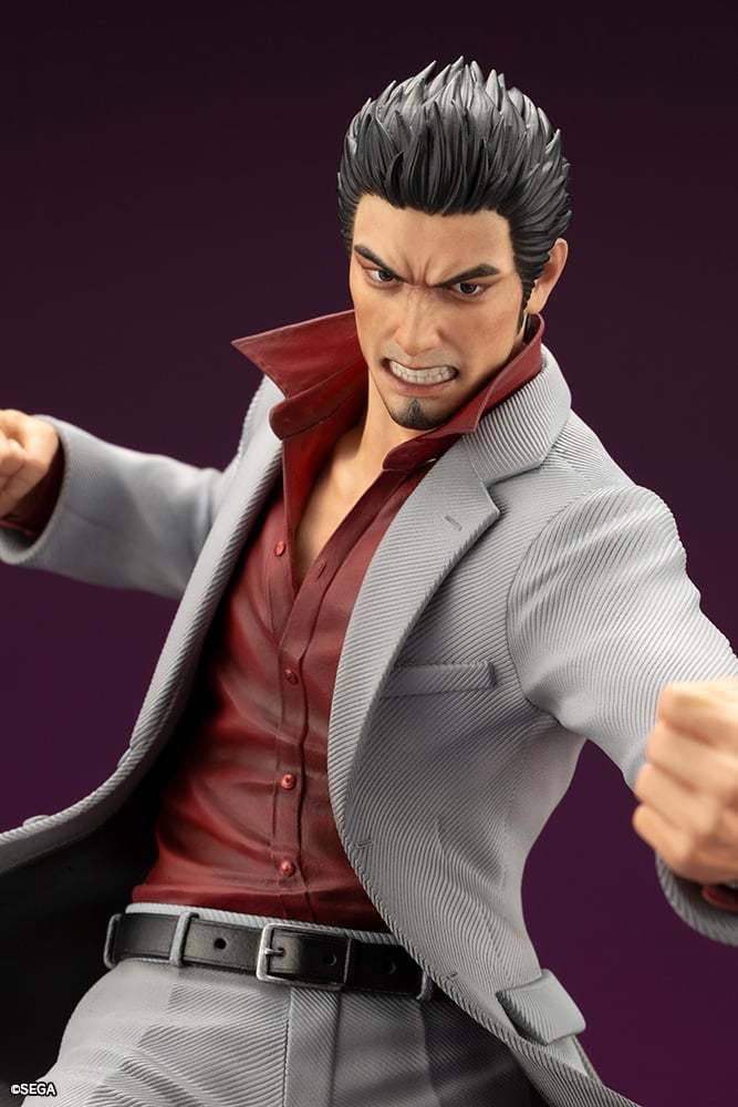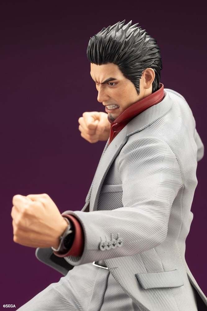 本次的桐生一馬1/6比例塗裝完成品高約29公分,製作了他全力以赴的戰鬥姿態,雕刻還原在遊戲中穿著白色西裝搭配紅色襯衫的造型,細緻重現西裝布料的織紋、皮鞋的鱷魚皮紋理與袖扣等造型細節,底座製作了畫有白線的柏油路面,呈現像是在路邊與人衝突的場景,猙獰的面容和魄力的姿態散發出強大的氣場,展現堂島之龍的霸氣!