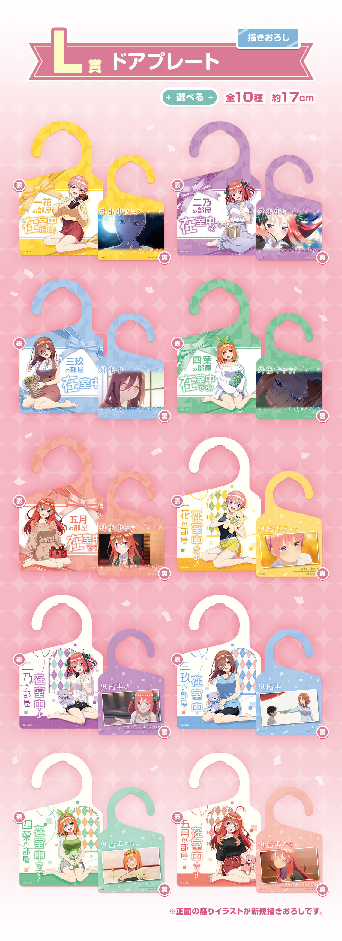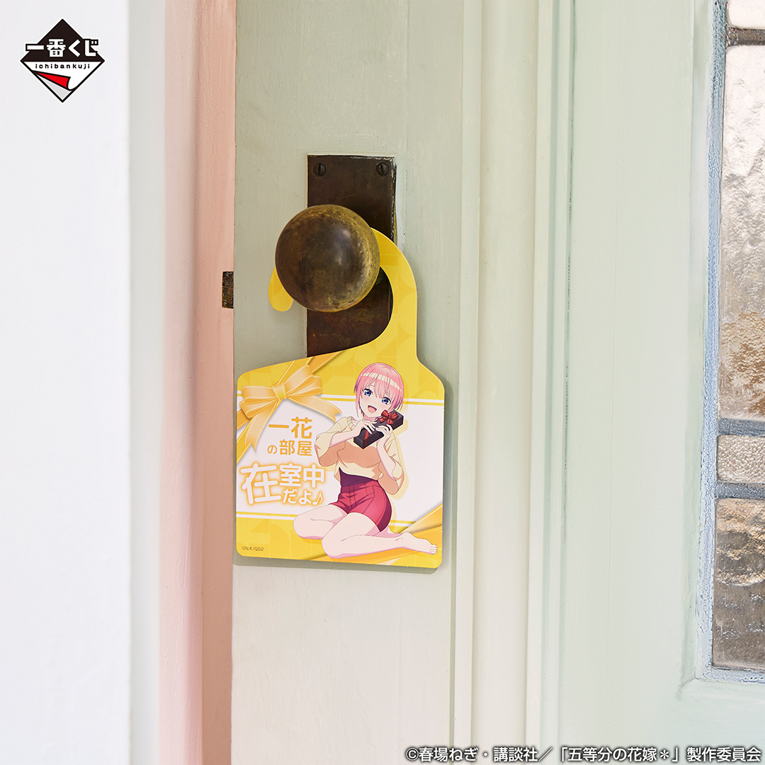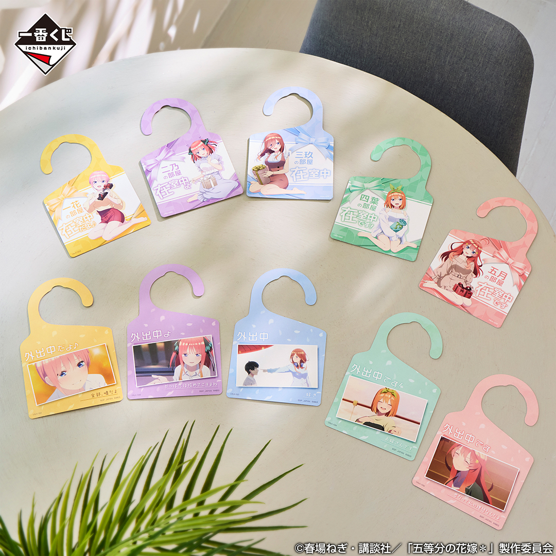 「一番賞 五等分的新娘*~和你一起度過特別的日子~」,共有 A賞 ~ M 賞 + 最後賞的豐富賞品!以「特別的約會日」為主題,都繪製了全新的插畫,並各別推出高達80公分的「五胞胎超大展示板」(A-D賞依序為:中野一花、中野二乃、中野三玖、中野四葉、中野五月),獻上女孩們精心準備的禮物~放家中就可以營造出和她們一起過節的場景!另外還有高約 35 公分的「五胞胎半身像壓克力牌」則是「在家度過特別的約會」主題!以及K賞壓克力立牌、L賞門牌、 M 賞資料夾與貼紙套組等,最後賞還帶來了全新系列的「Hyper Mega 壁掛」200公分超大尺寸,只要展開布置就能瞬間進入畫中場景!
