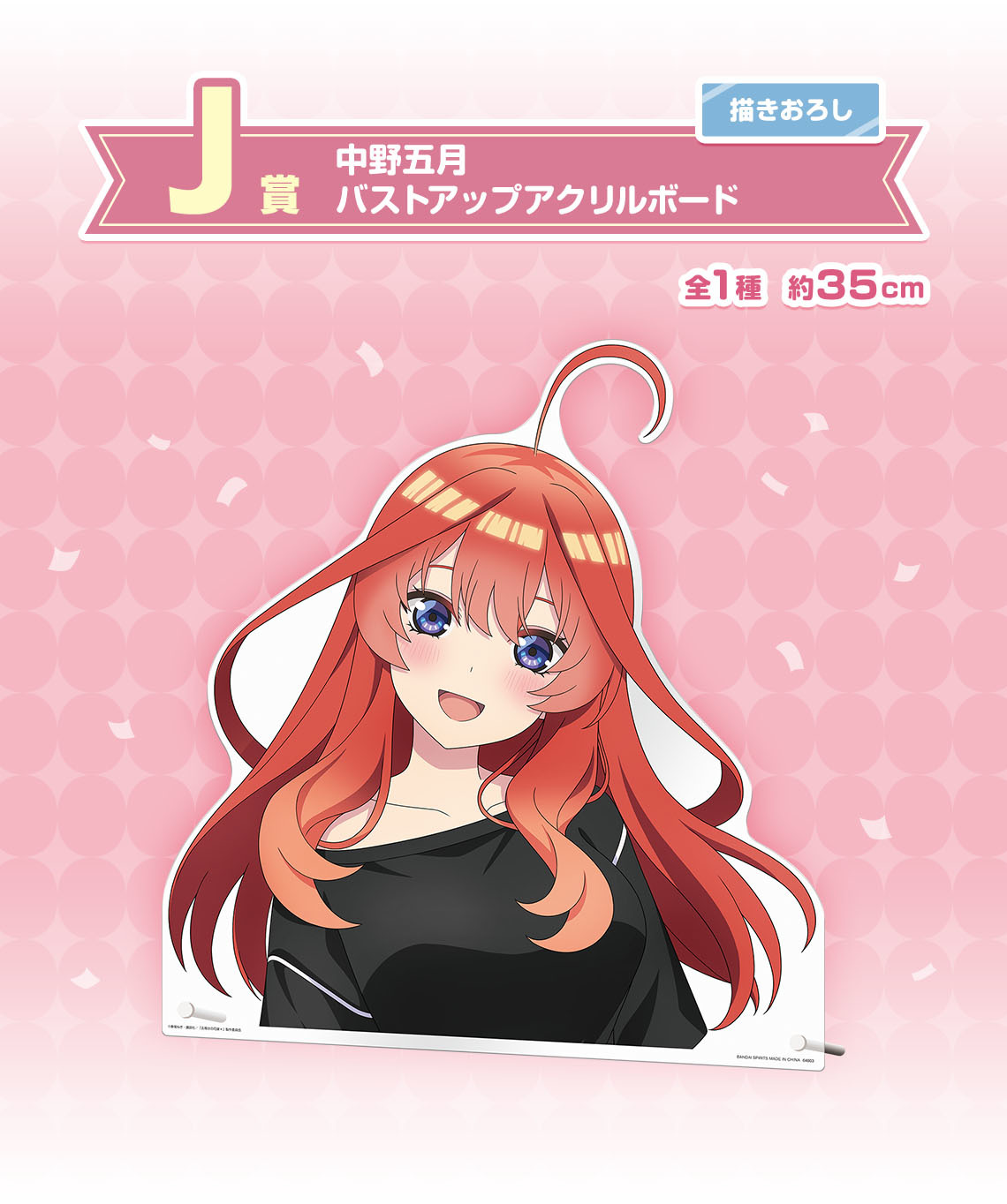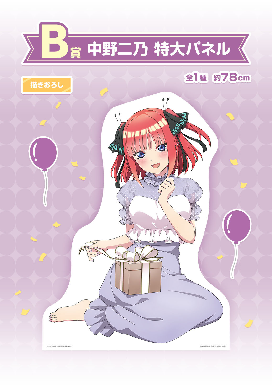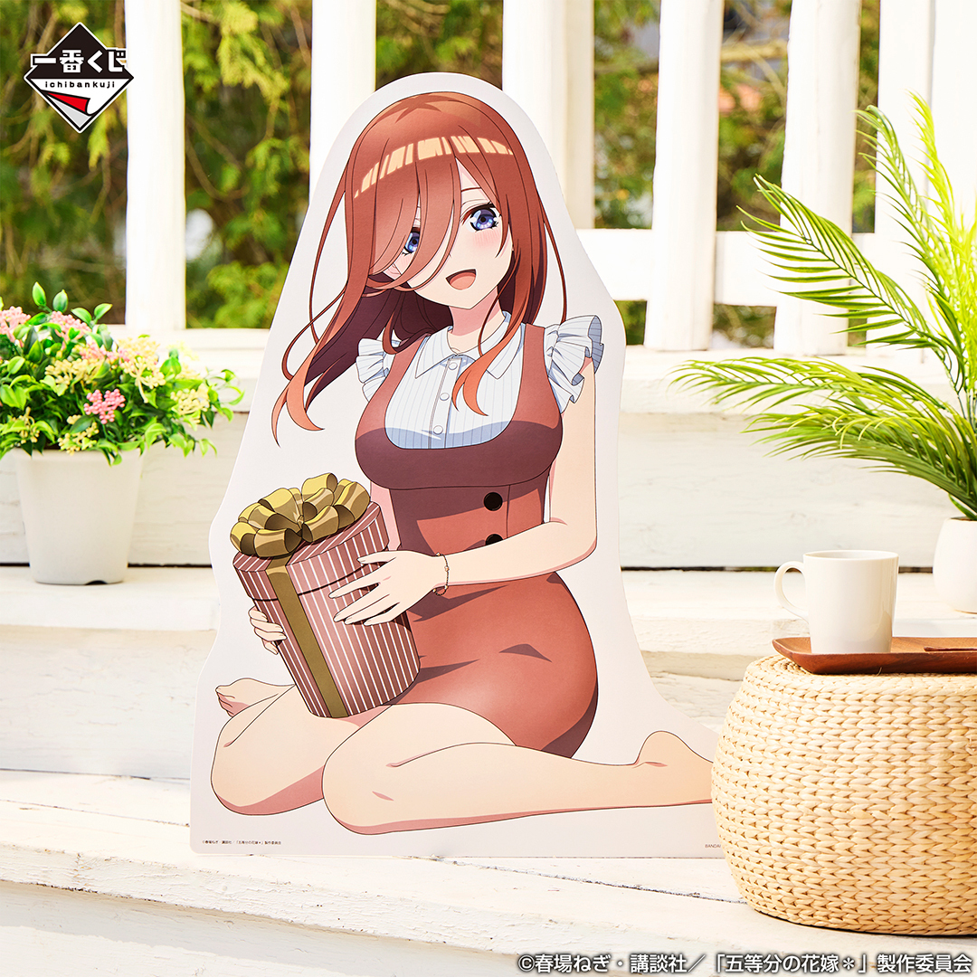 「一番賞 五等分的新娘*~和你一起度過特別的日子~」,共有 A賞 ~ M 賞 + 最後賞的豐富賞品!以「特別的約會日」為主題,都繪製了全新的插畫,並各別推出高達80公分的「五胞胎超大展示板」(A-D賞依序為:中野一花、中野二乃、中野三玖、中野四葉、中野五月),獻上女孩們精心準備的禮物~放家中就可以營造出和她們一起過節的場景!另外還有高約 35 公分的「五胞胎半身像壓克力牌」則是「在家度過特別的約會」主題!以及K賞壓克力立牌、L賞門牌、 M 賞資料夾與貼紙套組等,最後賞還帶來了全新系列的「Hyper Mega 壁掛」200公分超大尺寸,只要展開布置就能瞬間進入畫中場景!