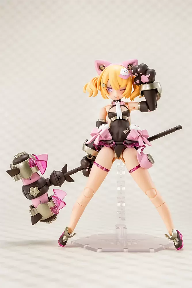 裝備全身裝甲、武器「黑暗腳印大鎚」後即可再現武裝模式,能夠搭配可動支架把玩出躍動又可愛的揮鎚姿勢,如同設定也能將鎚頭零件分解,裝備至雙手切換以速度取勝的「超級黑貓拳」模式。此外全身零件採用共通規格的 3mm 口徑孔軸連接,能夠發揮創意自由替換組裝部位,或搭配『女神裝置』、『機甲少女』、『創彩少女庭園』...等壽屋旗下組裝模型進行改裝。