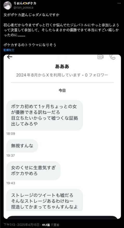 因此,也讓りおん備感壓力,在 2025 年 4 月 15 日公開了這則無理的私訊留言,並於貼文中表示:「女生不能玩寶可夢卡牌嗎?因為我是新手,一直在猶豫要不要參加那個一直想去的道館對戰,終於下定決心參加了,結果竟然獲得了優勝,真的非常開心,可是……現在玩寶可夢卡牌好像會變成創傷了。」
