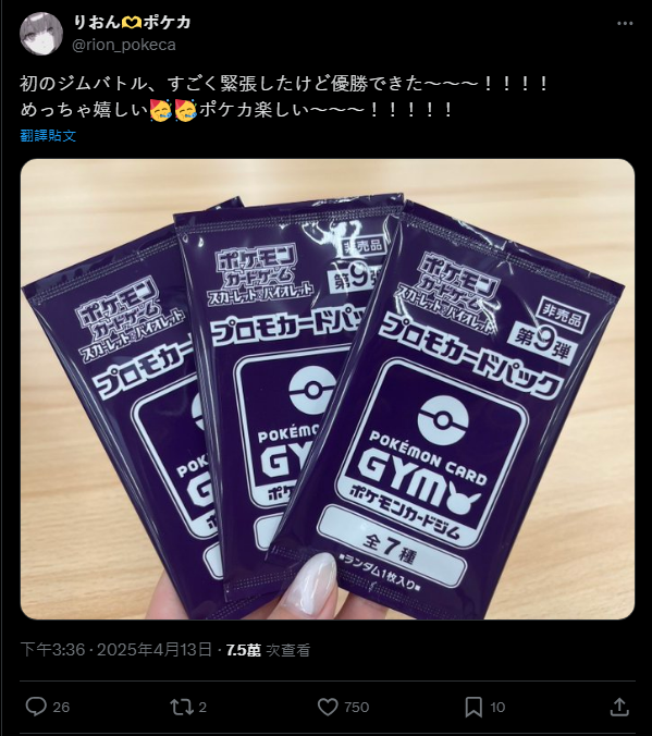 近日在 X(前 Twitter)上,一位名為「りおん」(@rion_pokeca)的女性寶可夢卡牌玩家分享了她於 2025 年 4 月 13 日首次參加寶可夢卡牌道館賽的獲勝紀錄。她也曬出優勝卡牌作為獎品,並開心表示:「第一次參加道館對戰,超級緊張但居然拿到冠軍了~~~!!!!」