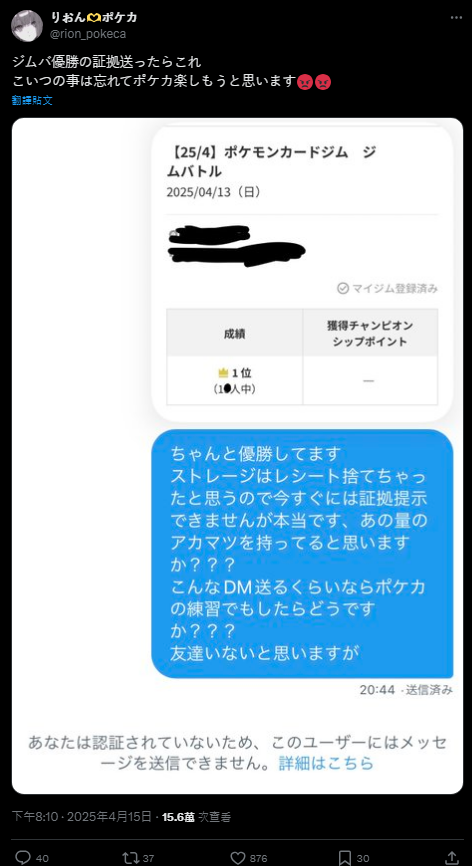 當然,りおん也不甘示弱地向對方提出道館對戰優勝的證據,並回嗆對方「有時間發這種私訊,不如去練練寶可夢卡怎麼樣???雖然我覺得你應該也沒什麼朋友啦。」