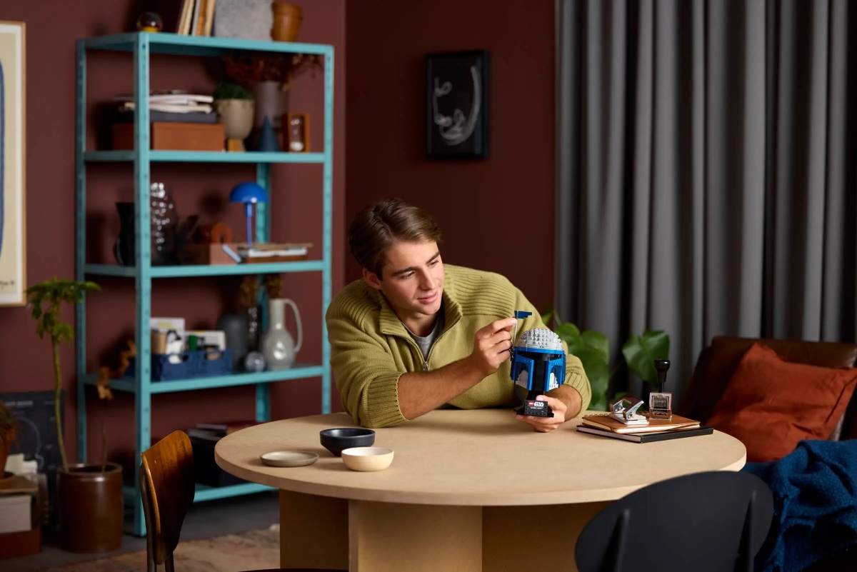 首先是根據《星際大戰二部曲:複製人全面進攻》設定打造,採用 616 片零件、組完高度來到 21 公分的強格·費特頭盔,再現了標誌性的黑灰藍配色以及中央象徵曼達洛人的 T 字紋路,而且位於右側的瞄準鏡還具備可動機構,重現劇中作戰時的樣貌。跟 2020 年推出的「75277 波巴·費特頭盔」一起展示肯定超讚。