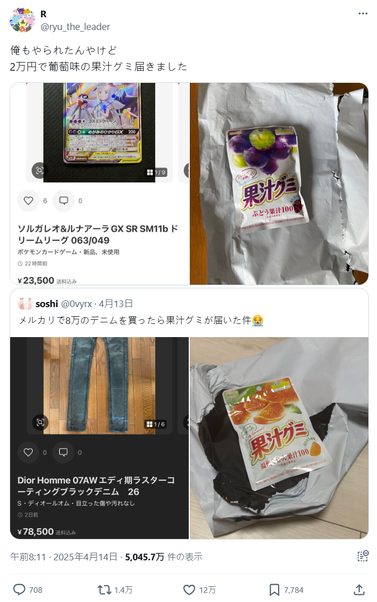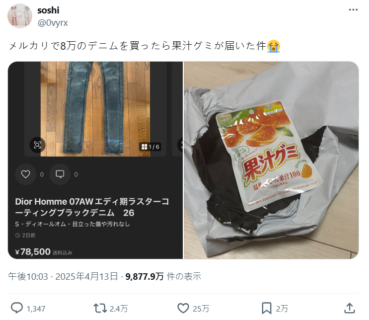 近日有位推主 soshi(@0vyrx)分享了自己最近在二手電商平台 Mercari 購物時的慘痛經驗。他表示,花了接近 8 萬日圓買了一條 Dior homme 的牛仔褲,沒想到包裹一打開,裡面只有一包超市常見的「果汁軟糖」,連褲子影子都沒看到,讓他傻眼到說不出話來。這件事情也在日本網路上群上引起討論,甚至還發現不只一人受軟糖詐騙所害。