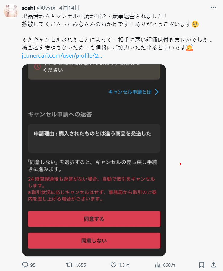 後來這件事情在 X 上鬧大了之後,後續 Mercari 也承諾協助他退款,對於這樣的網路詐騙出現在平台也感到十分抱歉。