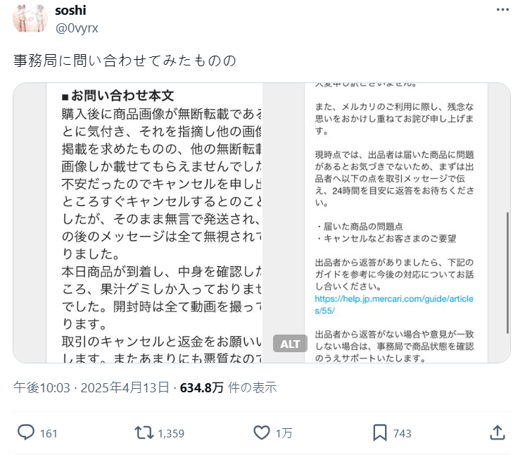 推主氣得表示,這位賣家售後也完全不接受指控,只推給 Mercari 處理物流造成這樣的結果,他沒有義務要承擔這樣的問題,所謂的「果汁軟糖」跟他一點關係都沒有。Mercari 的客服起初也對這件事情消極處理,讓他大感失望。