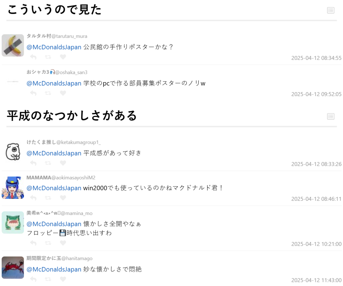 日本麥當勞這張宣傳圖在釋出後立刻引起迴響,有網友表示「這根本是社區活動中心的手作海報」,也有人聯想到「學校社團用學校電腦做的招募海報」,嘲諷意味十足。然而,也有不少人認為這股「懷舊風」充滿魅力,直呼「喜歡這個平成感」、「懷舊感直接炸裂」、「想到用磁片的時代了」。