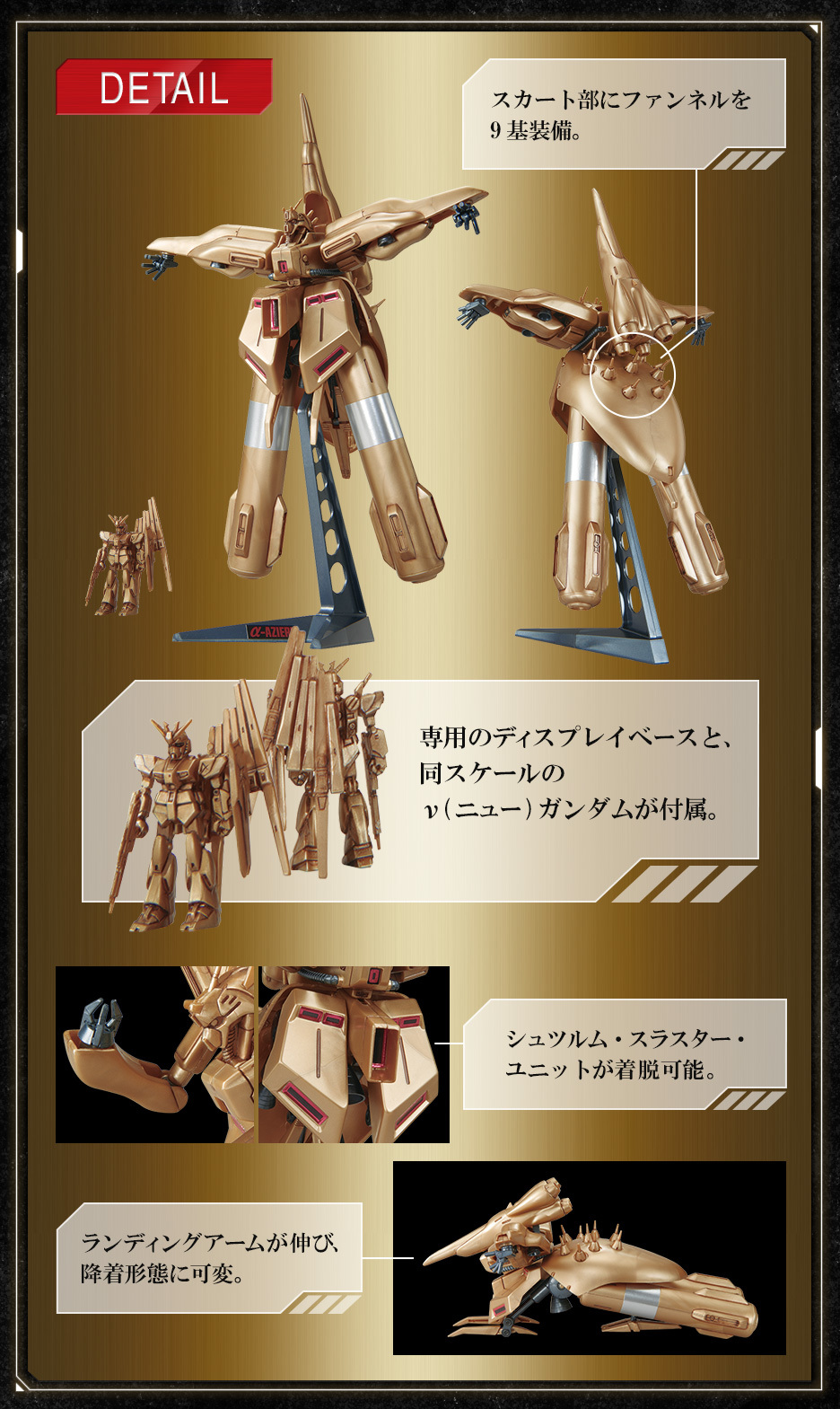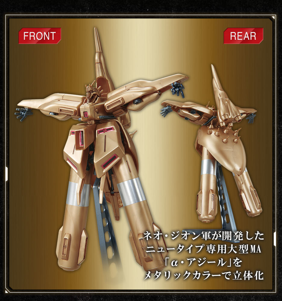 此次推出的「1/550 α・阿基爾 [金屬質感]」基於 1988 年萬代推出的老模型「1/550 α・阿基爾」修改而來,將 α・阿基爾、ν鋼彈的零件成型色改為黃銅般的金屬成型色。無論是兩架機體的造型、台座都與當年商品相同,兼具接縫明顯的古老分件設計與現代金屬成型色帶來的豐富水波紋。