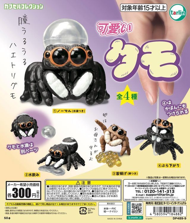 發行許多話題商品的玩具品牌 株式會社 Tarlin International (前 EPOCH 轉蛋事業部),推出以蜘蛛為主題的趣味商品:「可愛的蜘蛛」轉蛋,共有四種款式,參考售價為一轉 300 日圓,預計將於 2025 年 04 月開轉~