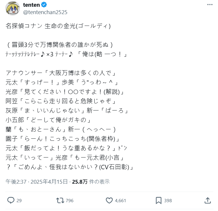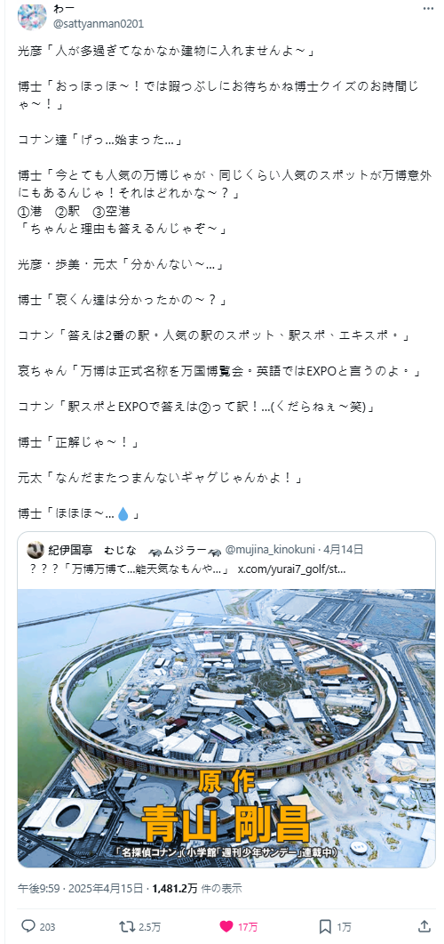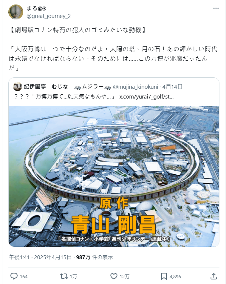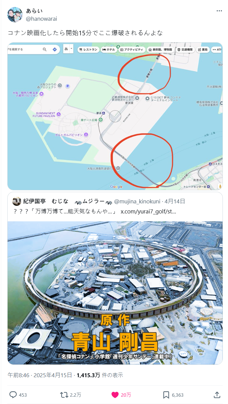 前幾天在日本引起熱議,因為大阪世博主場館「大屋頂環形結構」日前曝光意外在日本網友間掀起一股「《名偵探柯南》劇場版既視感」風潮,瞬間湧入各種網友腦補劇情,各種世博主題的劇場版柯南會出現的事情,已經變成網友的幻想討論串。
