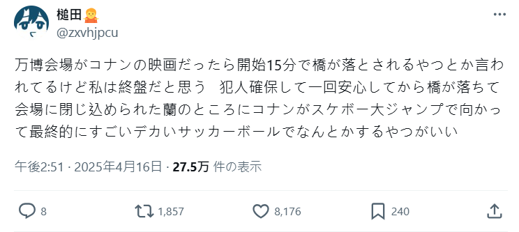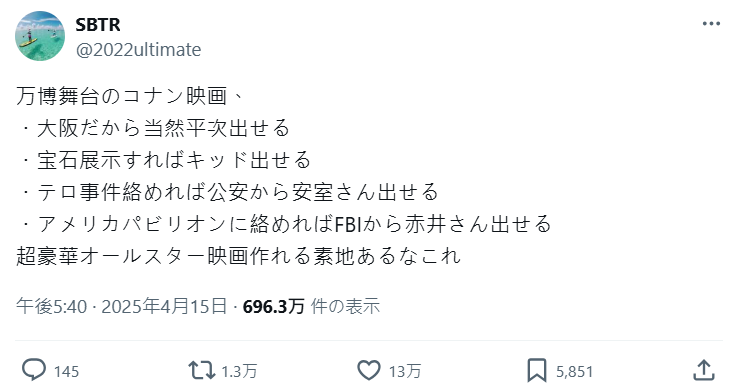 篇章架構上,也有網友提供概念。既然是大阪世博,服部平次絕對是要出現的,如果又有寶石或珍藏品展示,怪盜基德也不能缺席。如果有恐攻騷動的話,公安的安室透也會登場;跟會場美國館有關聯的話,FBI的赤井秀一也會登場。看來已世博為主題,絕對是可以展現柯南全明星陣容的好 idea 阿 !
