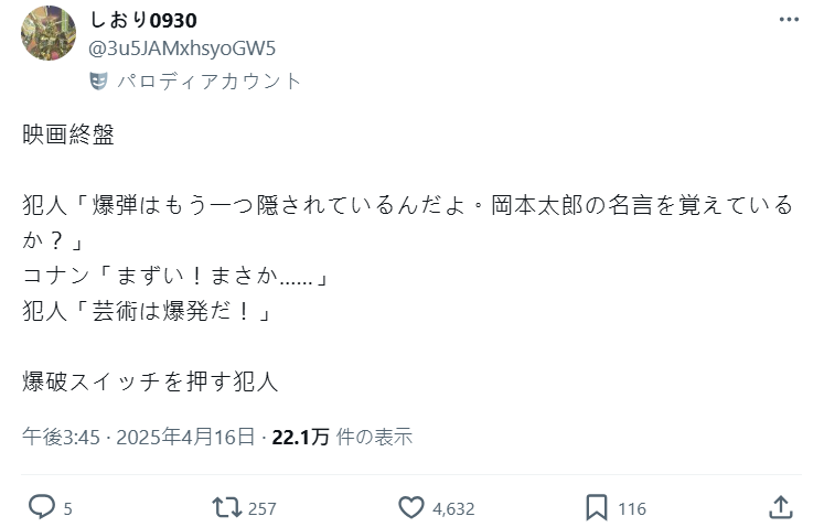 犯人:「其實我還藏了一顆炸彈啊。記得岡本太郎的名言嗎?」(岡本太郎:太陽之塔的設計者)
