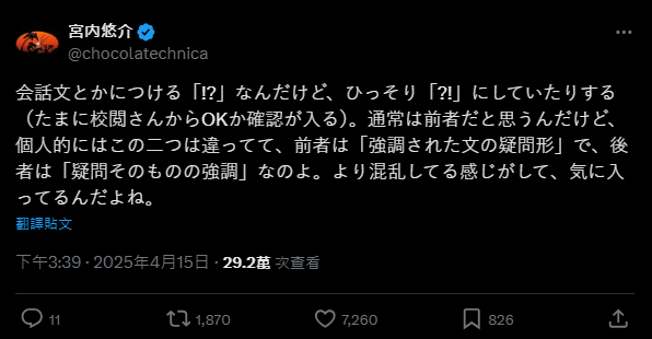 在小說對話中,「!?」這組感嘆與疑問混合的標點經常出現,但你是否曾注意過「?!」的存在?日本小說家宮內悠介(@chocolatechnica)近日在 X(前Twitter)上分享自己的小堅持,引發不少讀者關注與共鳴。