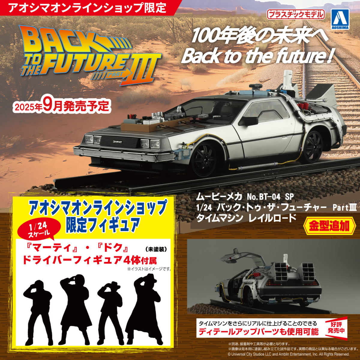 青島文化教材社旗下的電影製作者(ムービーメカ)系列推出經典電影《回到未來III》主題的新商品——「迪羅倫時光機 鐵道版」1/24比例組裝模型,參考售價為7,260日圓,預計於2025年09月發售!