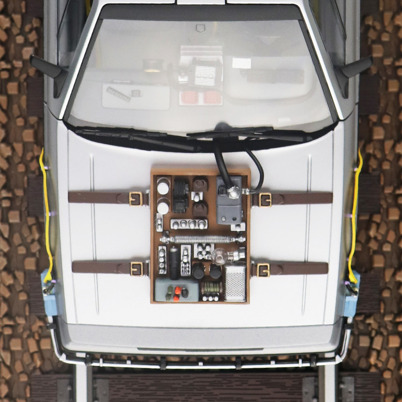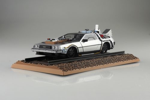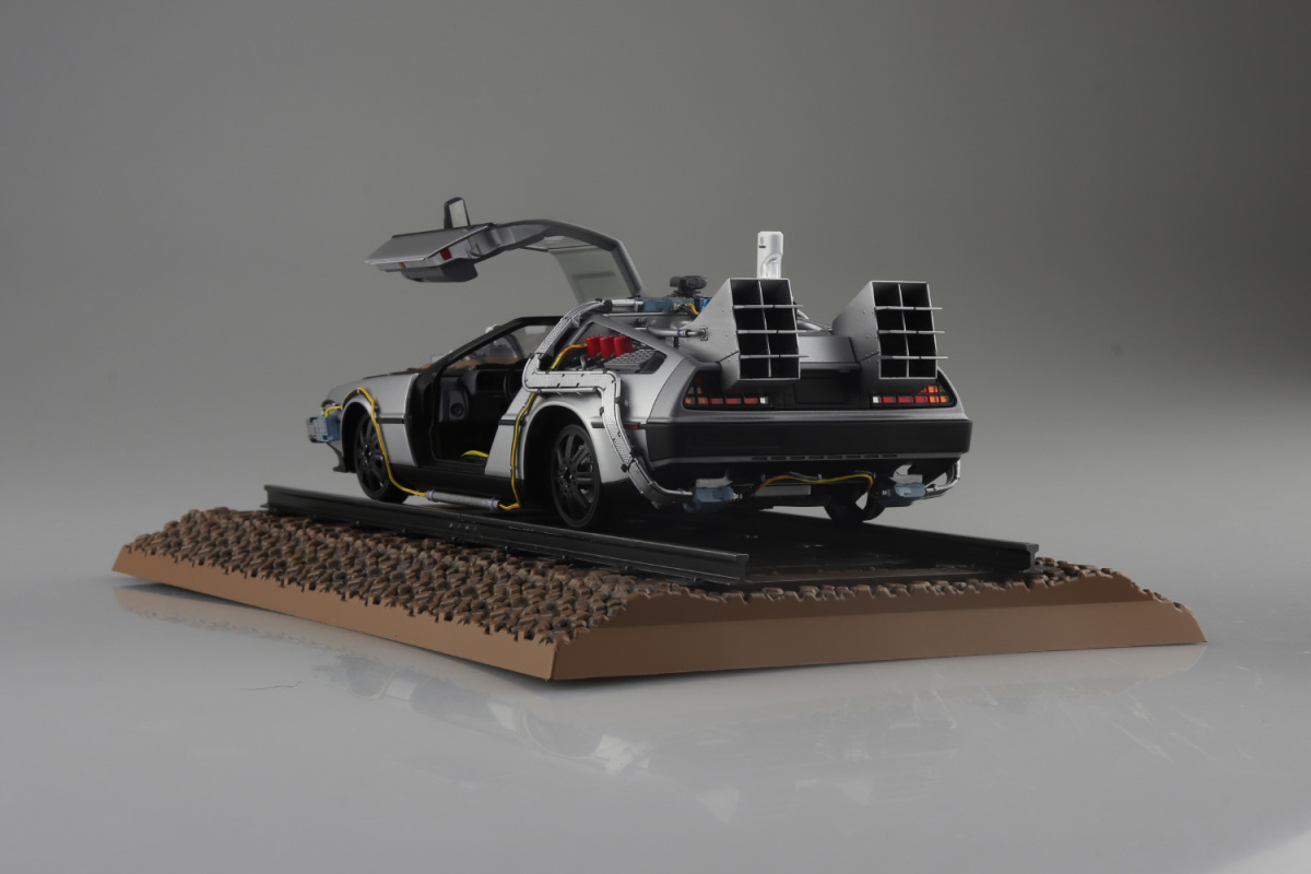 本次的組裝模型便是將迪羅倫時光機被放在鐵道上的場景以1/24比例的塑膠模型再現,車身完成長度約18.4公分,還原迪羅倫時光機上為了在鐵軌上行駛安裝的火車專用車輪以及綁在引擎蓋上的零件細節,鷗翼車門在完成後作有可動可以開啟,並附上了馬蒂使用的對講機,底座精緻的還原了鐵路及碎石子的造型,將迪羅倫時光機放上便能完美重現電影帶給觀眾的感動!
