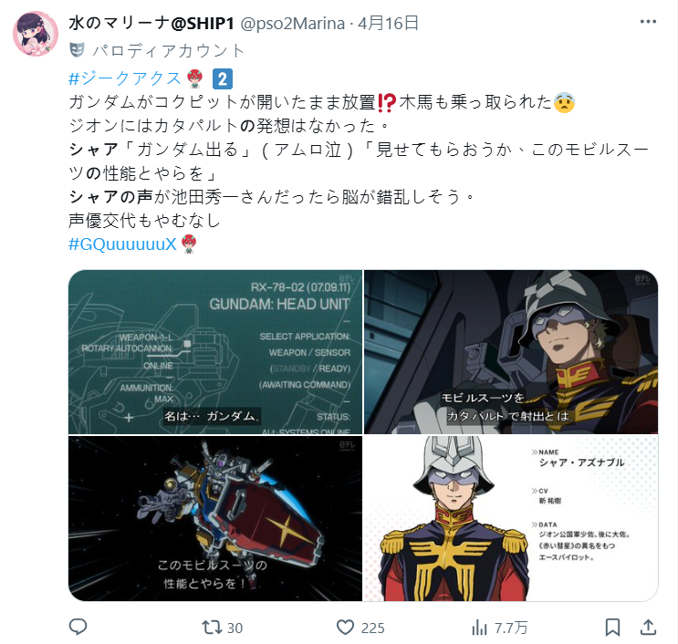 前日 ( 4/15 ) 播出動畫第二集「白色鋼彈」,其中在鋼彈作品中佔有重要地位的角色「夏亞・阿茲納布爾」也在本集登場,聲優從資深的池田秀一換成新生代聲優新祐樹,這個新版本「夏亞的聲音」第一次在電視中登場,也成為了網友熱議話題。