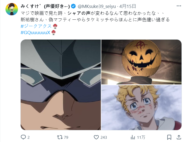 當然對於不少人來說,這聲音可能真的跟幾十年來的池田秀一差距不小,畢竟新祐樹現年 31 歲,出道至今作品比較為人熟知的包含 : 《東京復仇者》花垣武道、《排球少年!!》輪島友和、《怪獸8號》古橋伊春以及劇場版《機動戰士鋼彈 閃光的哈薩威》的南瓜頭劫機犯,要跟老牌聲優池田秀一比較,真的是比較為難。