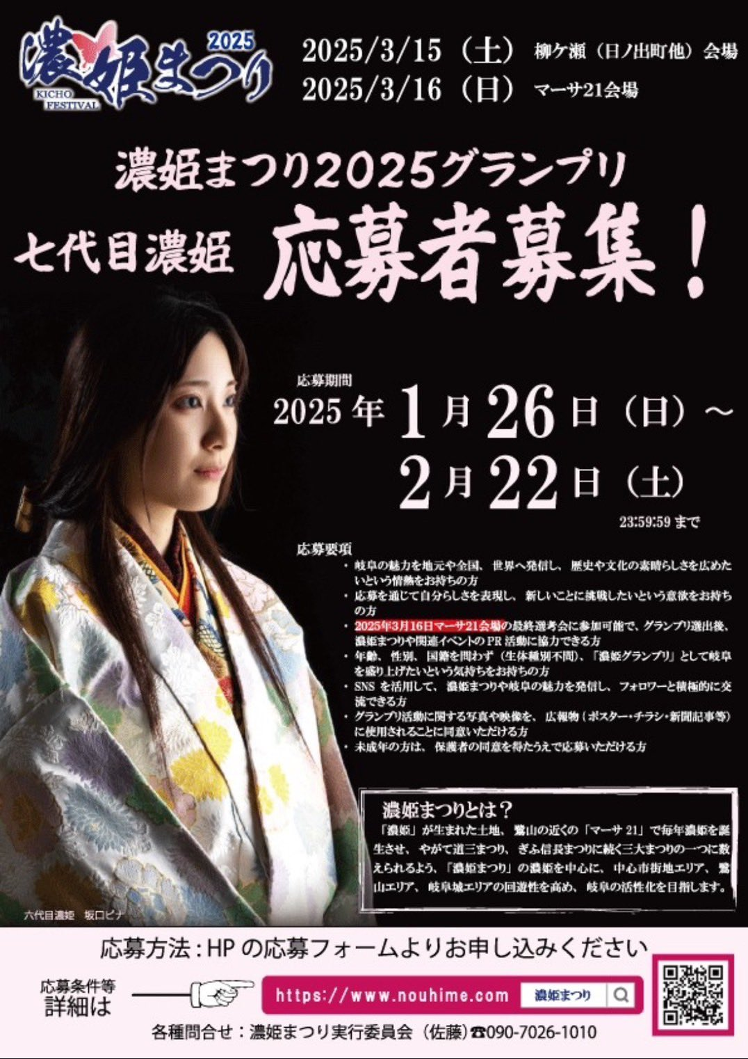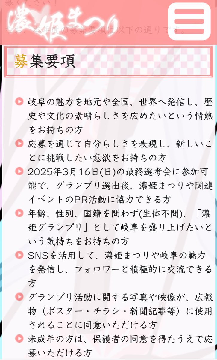 該活動的報名簡章中明列,參賽者不限年齡、性別、國籍,甚至生物種類皆可,只要具備推廣岐阜縣在地文化與歷史的熱忱,並能參與最終選拔及後續活動,即可報名參加。