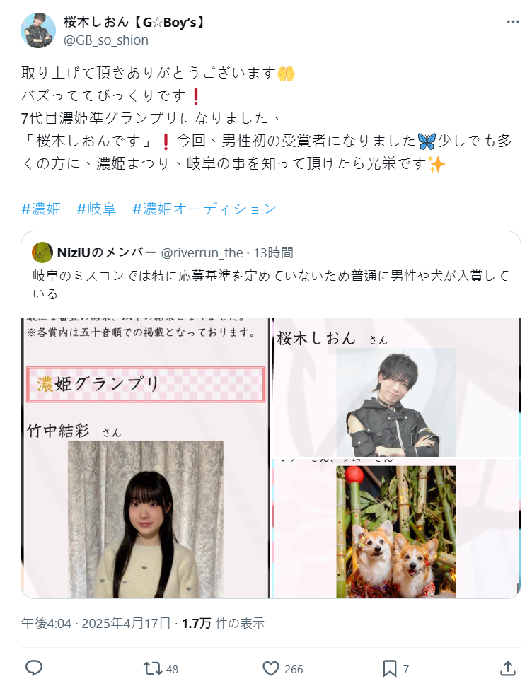 然而,這次第七代濃姬冠軍「桜木しおん」透過社群發文表示,他是第一位得獎的男性參賽者,對活動能受到關注感到非常驚喜,也希望能藉此讓更多人認識濃姬祭與岐阜的魅力。