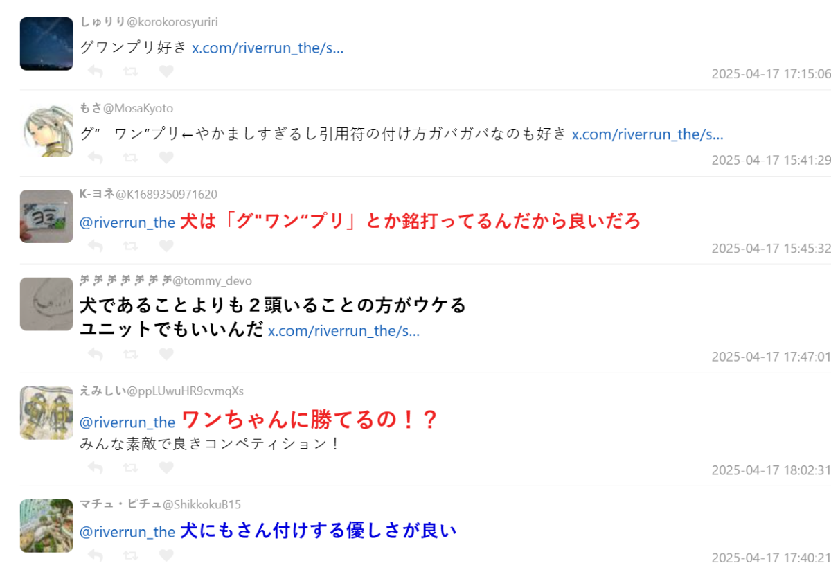 不少網友看到「狗狗」獲獎者被叫做「グ“ワン”プリ」,覺得這種名稱真的有夠有趣!比起狗,有網友更在意有兩隻狗一起參賽,原來可以組團啊 XD。且狗狗也被尊稱「○○さん」,這種貼心讓人十分喜歡。