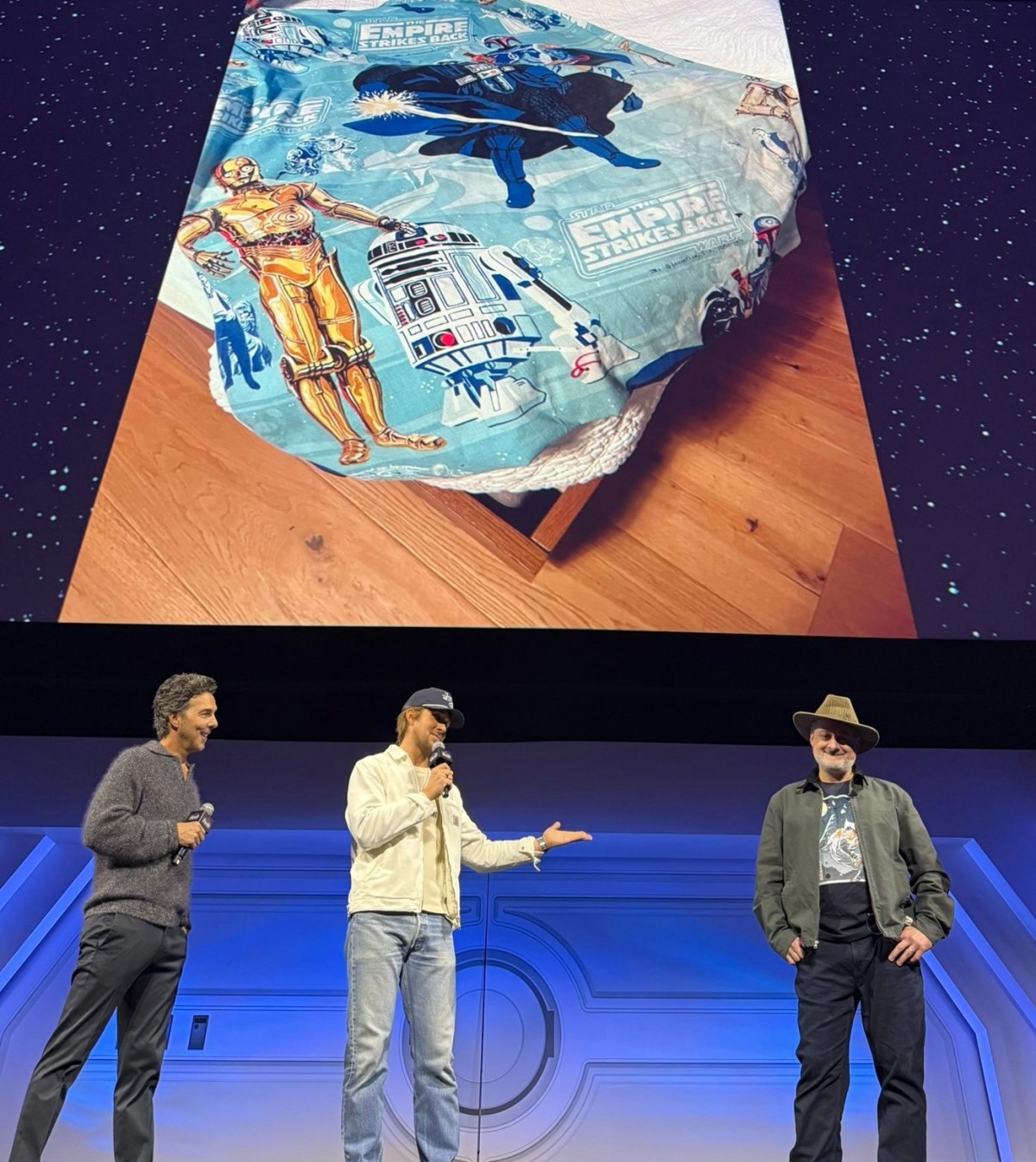 葛斯林和李維也有親自到場宣傳,其中,葛斯林還秀出了他的母親傳給他的一張童年照片,照片裡拍的是葛斯林兒時的《星際大戰》床單(下圖),想證明他從小就是忠實的《星際大戰》粉絲。