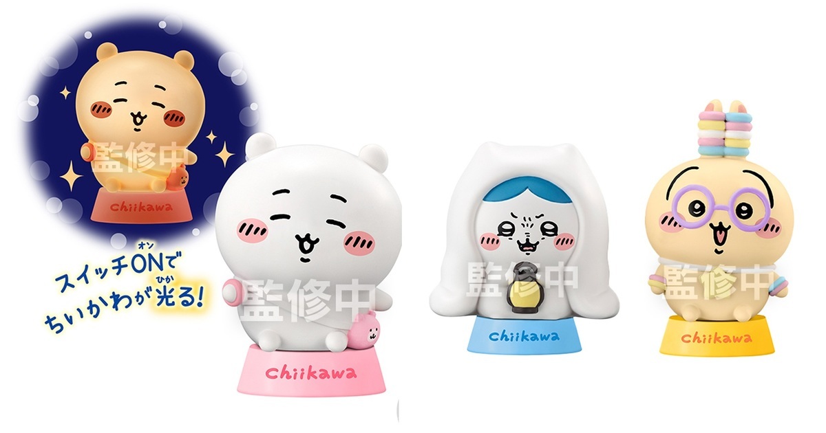 「吉伊卡哇 Charight 角色小燈」,將大人氣的吉伊卡哇角色設計成附底座的小夜燈,打開開關就換從內發出暖暖的光~!收錄有玩螢光棒的造型的吉伊卡哇(螢光手環)、小八(螢光手環)、兔兔(螢光棒大戶),以及在夜晚工作的吉伊卡哇(採集)、小桃(採集),講恐怖故事的小八、睡衣兔兔,7種造型,每種款式搭配角色,配有不同顏色的彩色底座,上面還印有chiikawa字樣~