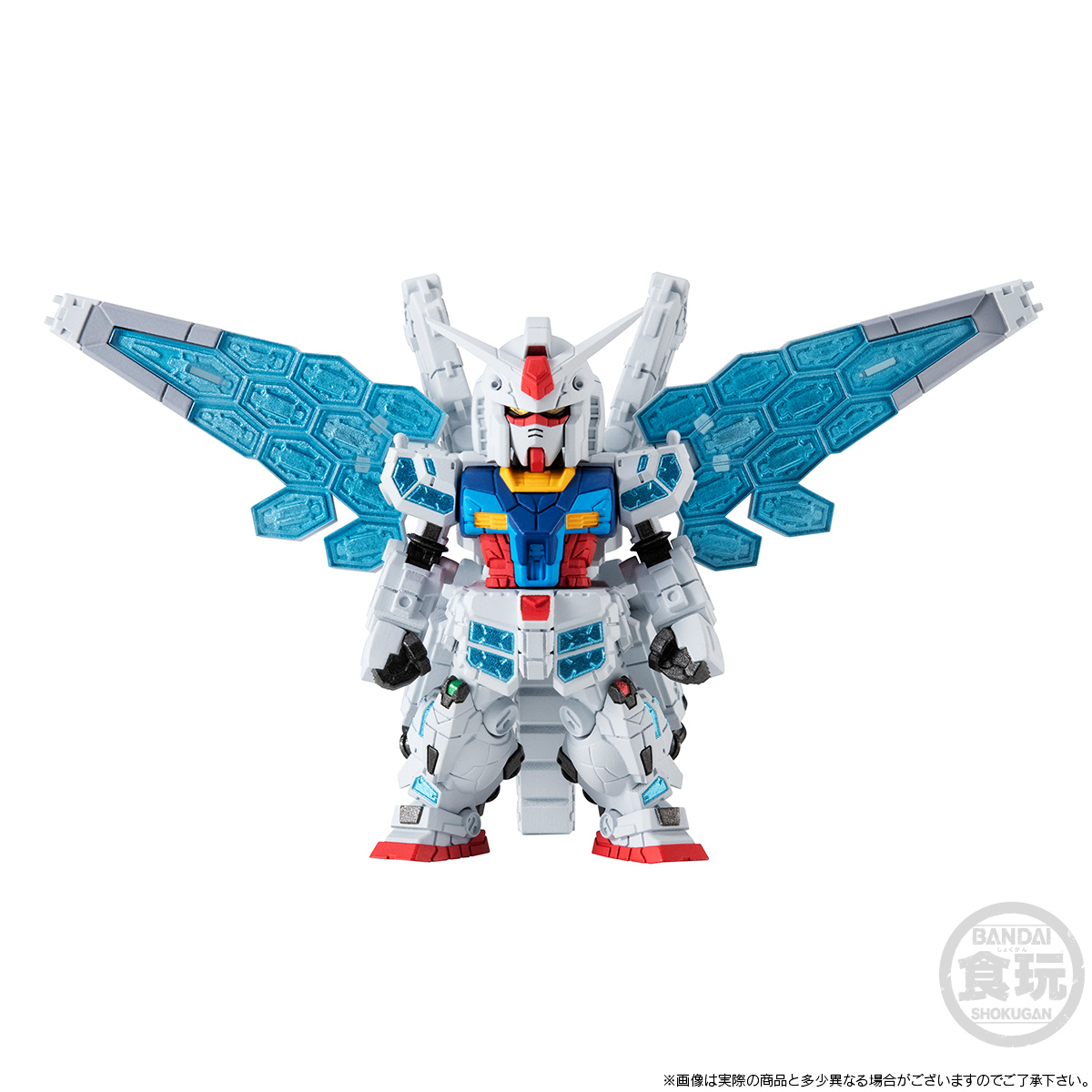 「FW GUNDAM CONVERGE RX-78F00/E 鋼彈」商品中收錄了「RX-78F00/E 鋼彈」和場館影像中登場的強化裝備「EX-001 GLASS FEATHER」,在全高僅 5.5 公分的 SD 比例下刻畫出精密的外裝甲、太陽能板細節,同時具備豐富的色彩塗裝。