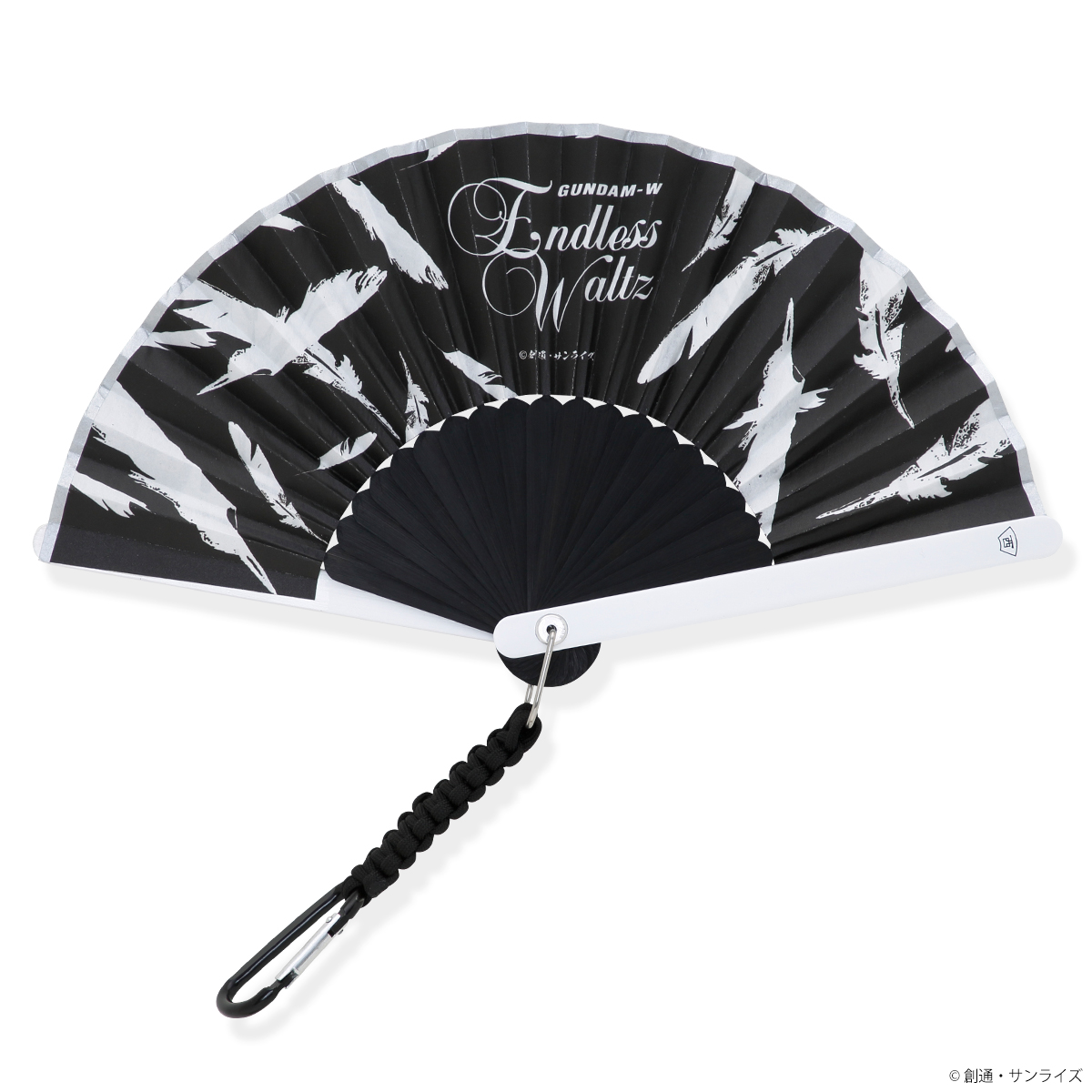 這把摺扇以筆墨繪風呈現出《新機動戰記鋼彈W 無盡的華爾茲》登場的「飛翼鋼彈零式EW」的英姿,設計相當有質感又充滿氣勢,另一面則是全黑配上象徵的天使羽翼羽毛,搭配作品的標題字樣。
