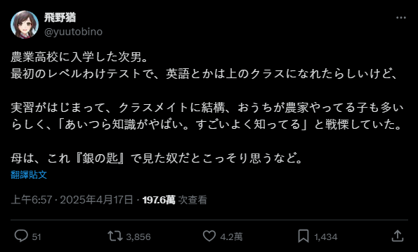 一位名叫飛野猶(@yuutobino)的日本網友近日在 X(前推特)上分享自家次男進入農業高中的見聞,貼文因其真實又富趣味的內容引發網友共鳴,短時間內獲得大量按讚與分享。