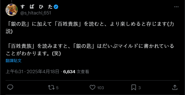 其中也有網友推薦表示:「「如果再加上閱讀《百姓貴族》(百姓貴族)的話,我想會更有趣喔!(強烈推薦),而且如果讀過《百姓貴族》,你就會發現《銀之匙》其實已經寫得很溫和了(笑)」