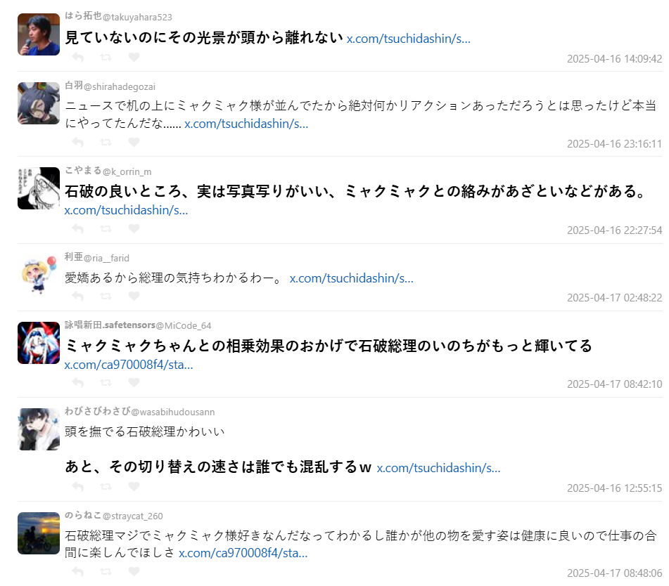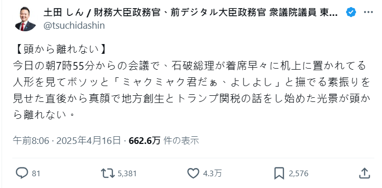 由財務大臣政務官的土田しん在 X 上發文表示,在早上 7:55 的會議上,石破茂總理一坐下就盯著桌上的娃娃,默默地說了一句:「是脈脈君耶~乖乖~」,還做出秀秀的動作。然後馬上神情一變,開始正經講地方創生還有川普的關稅政策……這畫面我現在都還揮之不去。