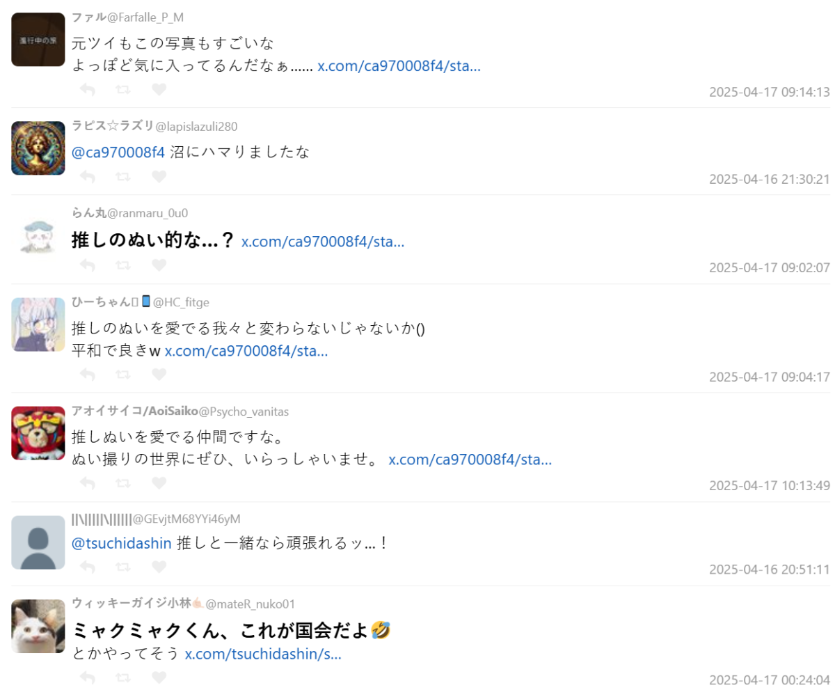 另有網友指出,石破總理雖然個性嚴肅,但這樣的反差萌讓人感到親切可愛:「沒想到總理這麼可愛」、「感覺他其實內心是個少年」、「如果總理下台後開個ぬい活(娃娃生活)帳號,我絕對追起來」。