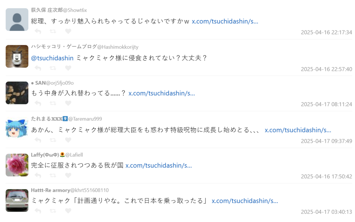 隨著話題延燒,更多網友開始開起總理的玩笑,有人笑說 :「石破總理被脈脈附身了吧?」、「是不是被換了靈魂」、「我們的總理已經完全淪陷」、「這是日本征服計畫的開端?」、「已經不是推民,是被推的那一方了」。