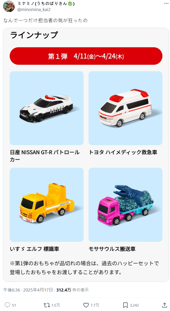 最早引起討論的是推主「ミナミノ」發文,她 PO 出第一彈的 TOMICA 陣容照並驚呼:「為什麼就有一台車子設計師突然走火入魔了啦!」引來網友熱烈回應。