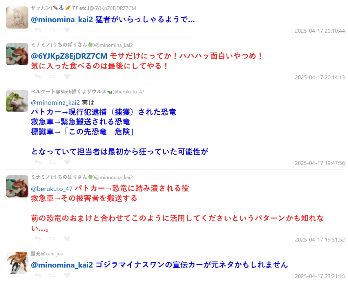 有人笑說:「這系列設計者可能一開始就不正常,警車=逮補恐龍,救護車=緊急送醫,標誌車=警告恐龍出沒…這整個是劇情設定吧?」也有人腦補劇情:「警車被恐龍踩爆→救護車來載傷患→然後出現滄龍搬運車,好像合理了?」,還有人懷疑這靈感來自《哥吉拉-1.0》的宣傳車。