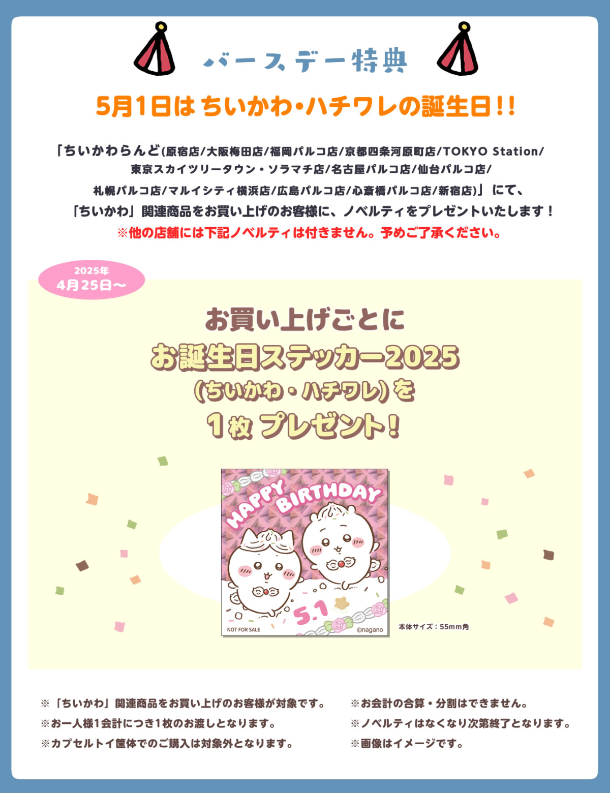 此外,5 月 1 日是小八的生日,只要在各地的吉伊卡哇 LAND 消費,即可以獲得 2025 年生日限定貼紙。